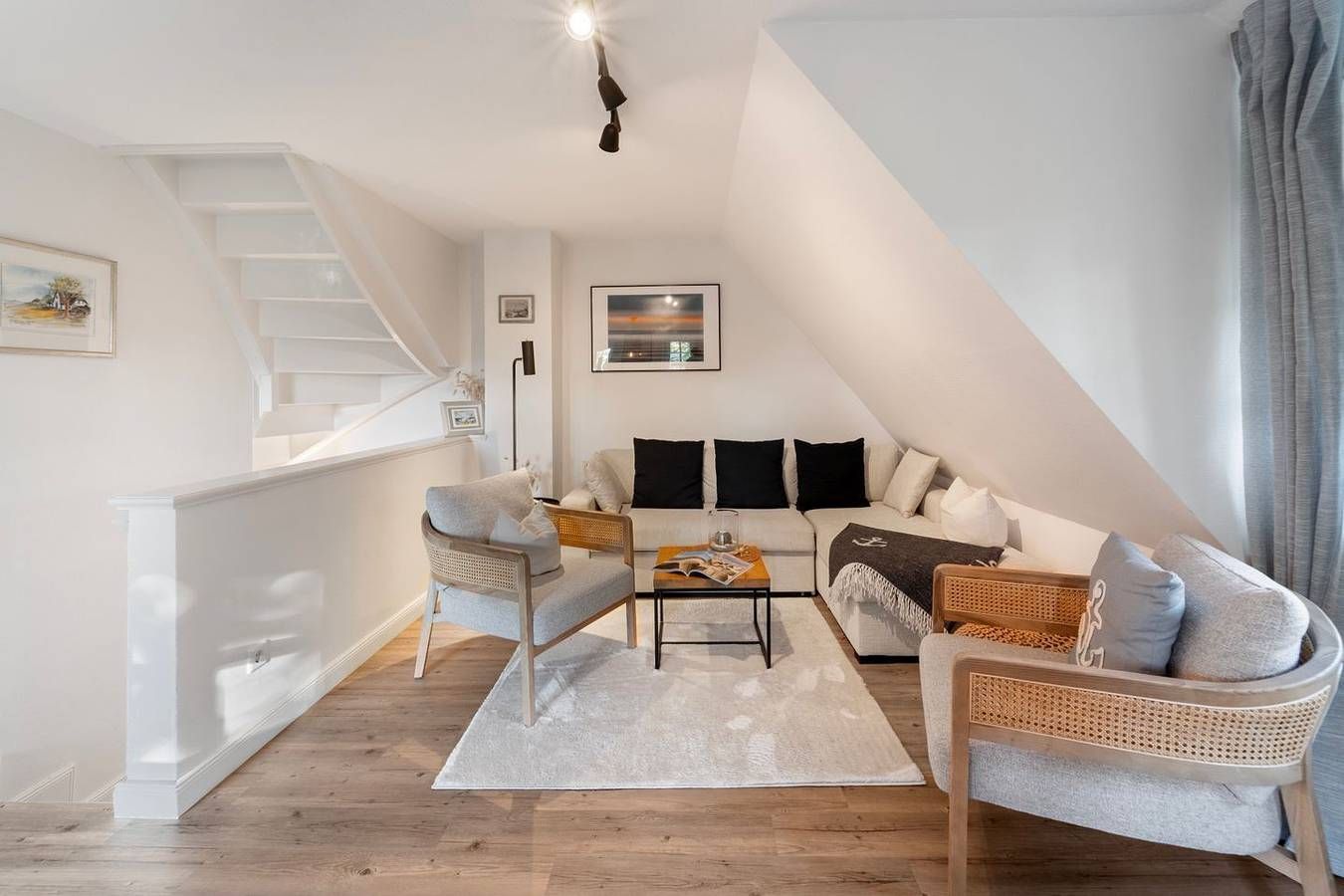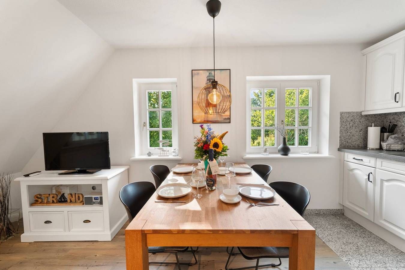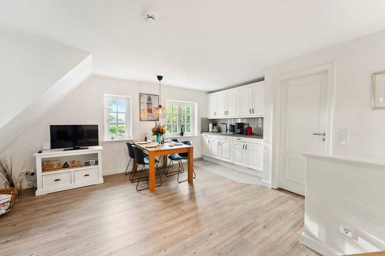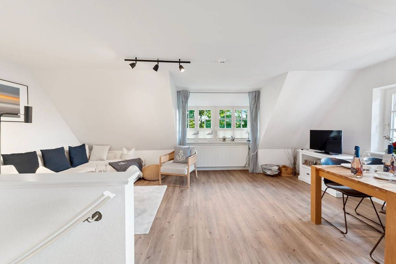 WOHLFÜHLOASE IM GRÜNEN KEITUM – ERLEBEN SIE ENTSPANNTE URLAUBSTAGE IN RUHIGER LAGE Genießen Sie die behagliche Atmosphäre dieser charmanten, reetgedeckten 3-Zimmer-Ferienwohnung im 'Landhaus Süderhof'. Auf ca. 66 m² über zwei Ebenen bietet die Wohnung Platz für bis zu 4 Personen. Ideal gelegen im Kapitänsdorf Keitum, bietet dieses Domizil Ruhe, Komfort und einen hauseigenen Wellnessbereich mit Schwimmbad und Sauna. **WOHNZIMMER UND ENTSPANNUNGSBEREICH** Das einladende Wohnzimmer ist mit einer gemütlichen Sofaecke und einem offenen Küchen-Essbereich ausgestattet, perfekt für entspannende Stunden. Die großen Fenster bieten einen herrlichen Blick, um die Sylter Landschaft oder den Sonnenuntergang zu genießen. Für Familien mit kleinen Kindern ist ein Kinderhochstuhl vorhanden. **OFFENE KÜCHE UND ESSBEREICH** Die Küche ist modern ausgestattet und lässt keine Wünsche offen – ideal für die Zubereitung von leckeren Mahlzeiten. Am angrenzenden Esstisch können Sie gemeinsam speisen und gemütliche Abende verbringen. **ZWEI GEMÜTLICHE SCHLAFZIMMER** Auf der ersten Ebene befindet sich ein Schlafzimmer mit zwei Einzelbetten (90x200 cm) und einer großzügigen Raumhöhe. Über eine Treppe erreichen Sie das zweite Schlafzimmer im Dachgeschoss, das mit einem Doppelbett (2x 90x200 cm) ausgestattet ist. Hier befindet sich eine großzügige Abseite, die als Stauraum für Kleidung und Koffer dient. **WOHLFÜHLBAD MIT DUSCHE** Das moderne Badezimmer mit bodengleicher Dusche und WC befindet sich auf der ersten Ebene und ist ein komfortabler Rückzugsort. **WELLNESSBEREICH MIT SCHWIMMBAD UND SAUNA** Ein Highlight ist der hauseigene Wellnessbereich mit Schwimmbad und Finnischer Sauna. Hier können Sie den Tag entspannt ausklingen lassen und neue Energie tanken. **PRAKTISCHE EXTRAS** Eine Waschmaschine und ein Trockner stehen gegen Gebühr im Haus zur Verfügung. WLAN (ohne Gewähr) und ein Pkw-Stellplatz sind ebenfalls vorhanden. Haustiere sind nicht gestattet.
