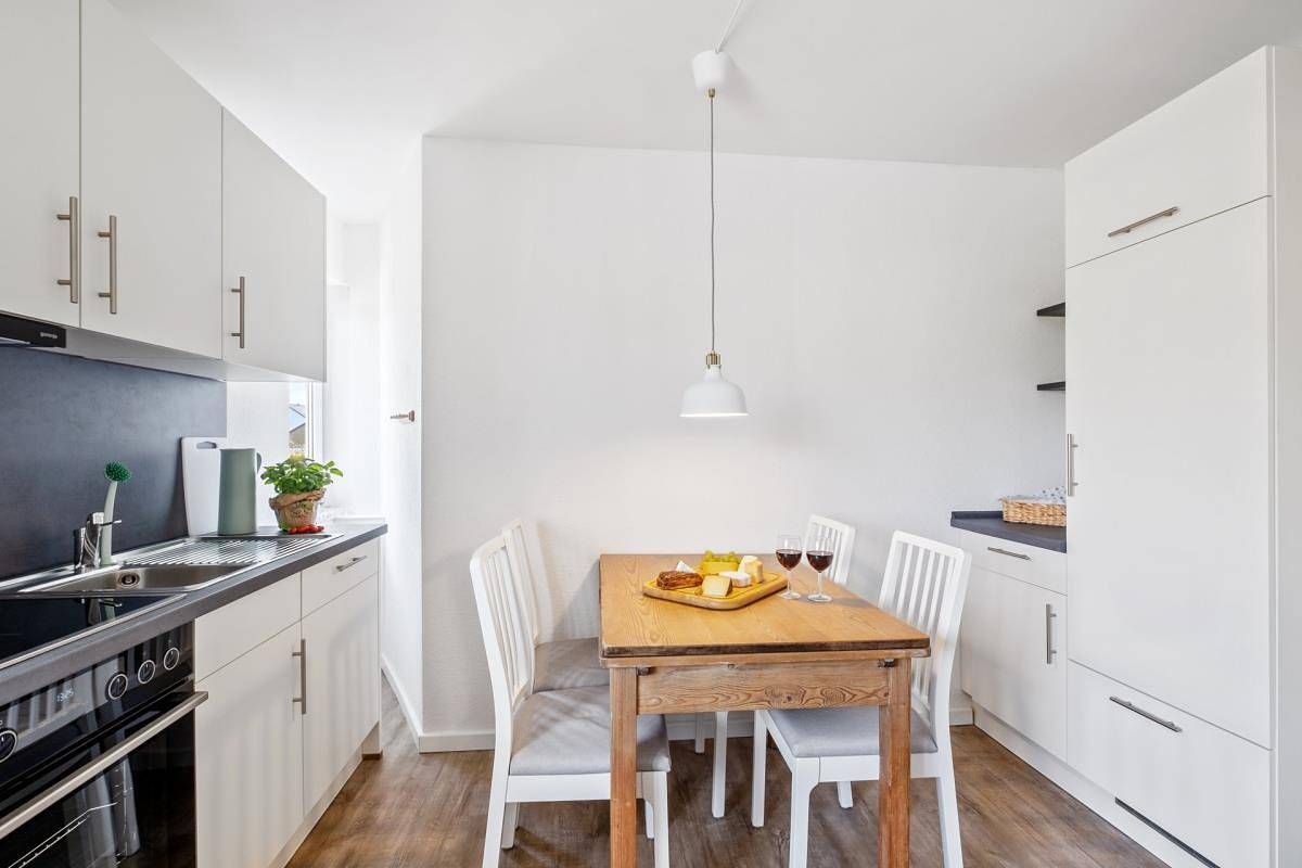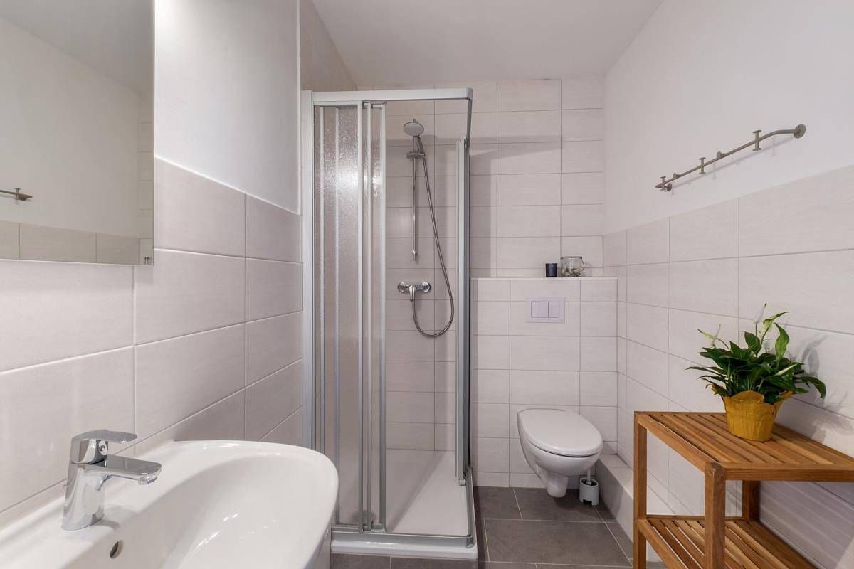 Top-Lage! Nah zum Ortskern (900m) und noch näher zum Strand (500m), zum Wohlfühlgarten (450m) und zur Familienlagune (500m) liegt unsere Wohnung "Wiebke" im 1. Obergeschoss eines klassischen Büsumer Rotklinkerhauses aus den 60er Jahren. Sie können direkt am Haus parken. Die helle und freundliche Wohnung hat einen praktischen und durchdachten Grundriss, vom Flur aus gelangen Sie in alle Wohn- bzw. Schlafräume. Im gemütlichen Wohnraum finden Sie in eine neue, hochwertige und voll ausgestattete Einbauküche mit Geschirrspüler, einen Essplatz, eine bequeme Sitzgruppe und einen Fernseher mit Kabel-TV. Das Bad verfügt über eine flache Duschtasse, ein WC und ein Waschbecken. Schlafraum 1 bietet außer einem Kleiderschrank einen bequemen Schlafplatz für eine bis zu zwei Personen in einem Ausziehdoppelbett 2x80x200. Das größere Schlafzimmer ist mit einem Doppelbett (1,80m x 2,00m) und einem Kleiderschrank ausgestattet. Von diesem Zimmer aus haben Sie Zugang zum kleinen Balkon, der in süd-westliche Richtung weist. Alle Böden der Wohnung sind mit allergiker-freundlichem Vinyl oder Fliesen belegt.