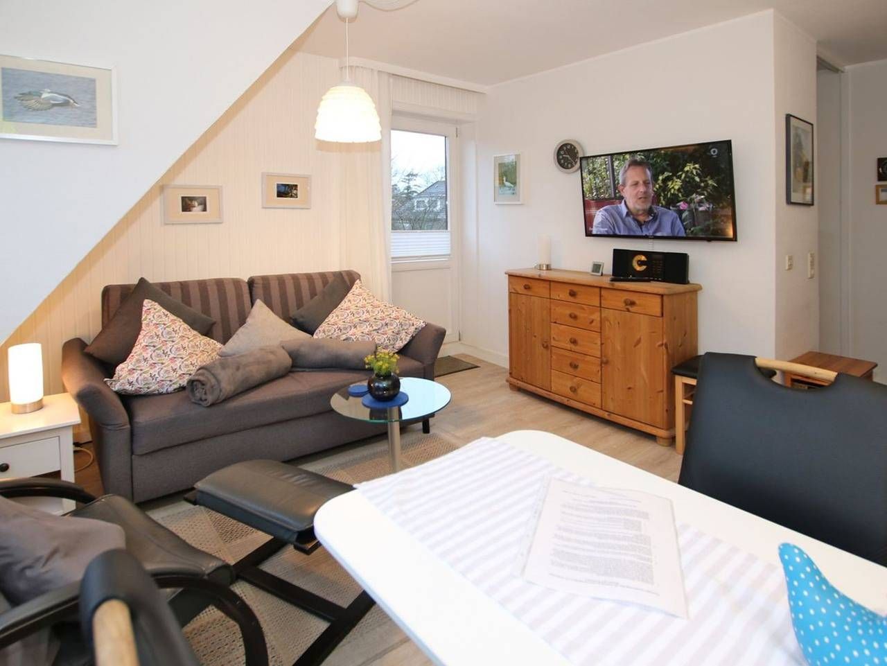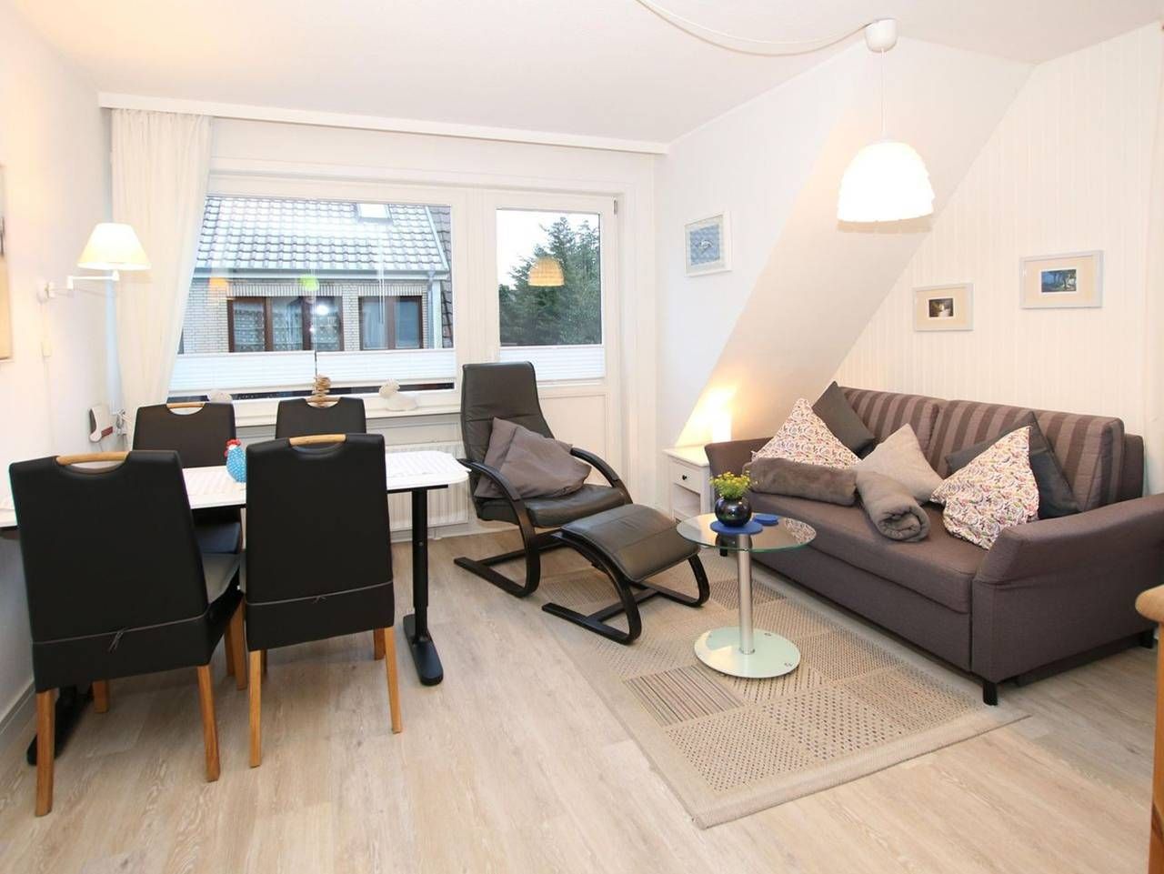 Ferienwohnung in Wyk auf Föhr, Wiesenweg 9,Wohnung Nr.4, Ca. 42 qm 2-Zimmer-Nichtraucherwohnung in der 1.Etage mit 2 Balkonen (Süden und Westen). WOHNZIMMER: gemütlich und neu eingerichtet, Zweierschlafcouch mit Ledersessel...