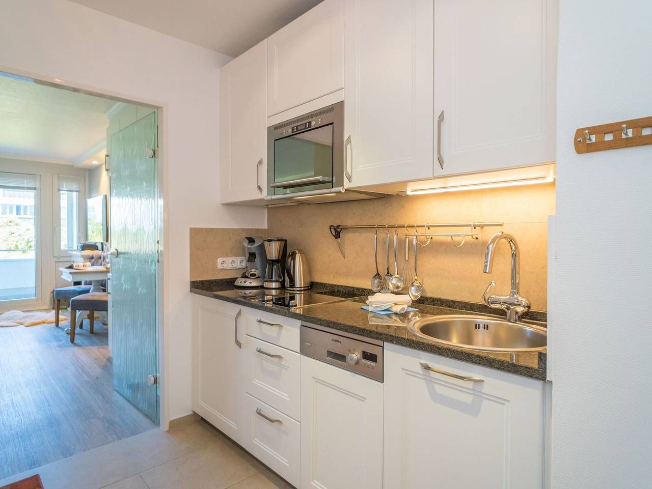Helle, luxuriös sanierte 1-Zimmer-Ferienwohnung im Hochparterre mit großzügigem Westbalkon, auf dem Sie von mittags bis zum Abend die Sonne genießen können. Das lichtdurchflutete, kombinierte Wohn-/Schlafzimmer mit edlem Designfußboden verfügt über einen großen Flat-TV. Ein gemütliches 2-er Sofa und ein Sessel versprechen Wohlfühlurlaub von Anfang an. Die stilvollen, handgefertigten Rivièra Maison Möbel verleihen der Essecke einen exklusiven Charme. Ein neues, komfortables beleuchtetes Schrankbett (2,00 m x 1,80 m, einzeln klappbar) gewährleistet einen erholsamen Schlaf. Die hochwertige Küchenzeile ist mit Markengeräten (Elektroherd, Kühlschrank, Geschirrspüler, Mikrowelle mit Grillfunktion, Kaffeemaschine, Wasserkocher, Toaster) ausgestattet. Das exklusive Bad mit großzügiger Dusche und edlem Waschtisch ist komplett in italienischem Naturstein gehalten. Stellplatz zu buchbar Eine Duplex-Garage kann für 8,00€/Tag oder ein PKW-Außenstellplatz für 14,00 €/Tag mit gemietet werden (begrenztes Kontingent!). Haustier willkommen! Ihr kleiner wohlerzogener Hund ist bei uns ein gerne gesehener Gast. Für das Mitbringen berechnen wir 5,00 € pro Tag und die Endreinigung erhöht sich um 10,00 €. Im Haus befindet sich ein kostenloses W-Lan-Netz, das für alle Appartements zugänglich ist.