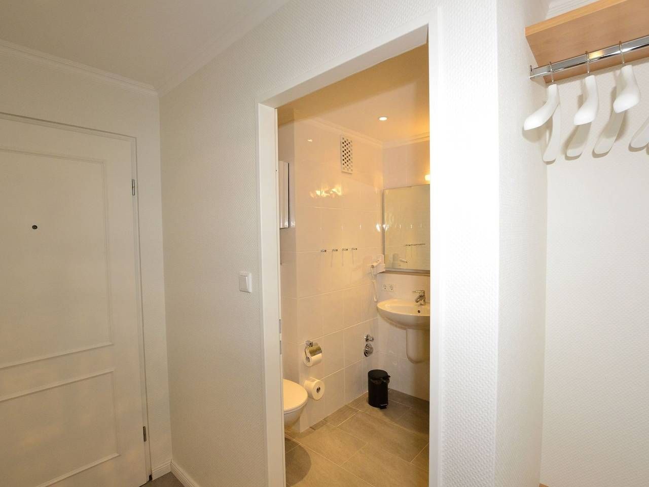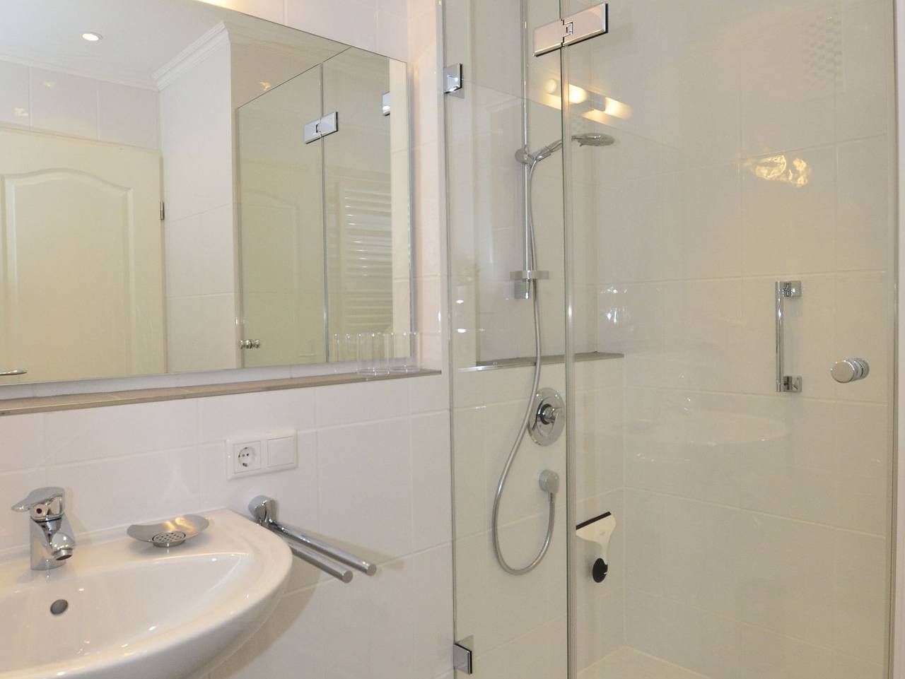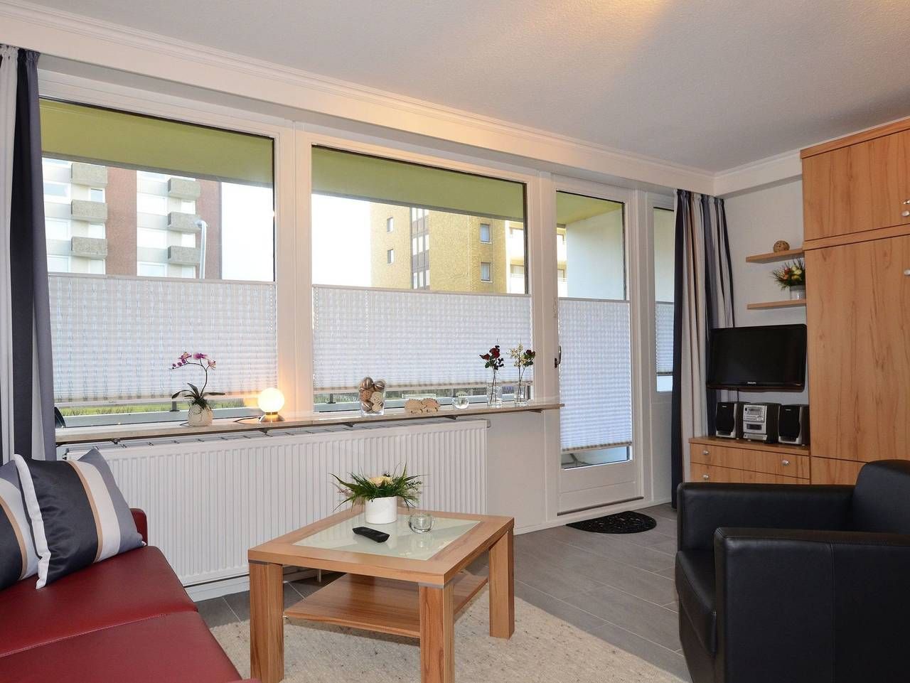 Großzügige 1-Zimmer-Ferienwohnung Besonders komfortable, mit großformatigen, schönen Fliesen ausgelegte 1-Zimmer-Nichtraucher-Ferienwohnung (ca. 36 qm) im Parterre zur Landseite mit Ostloggia (Morgensonne, mit Balkonmöbeln und Auflagen) für max. 2 Personen.[nbsp][nbsp] Vom Vorflur (mit Garderobe) gelangt man in das kombinierte Wohn-/Schlafzimmer (mit Austritt zum Balkon), in die separate Küche und in das moderne, neue Duschbad/WC. Der Wohn-/Schlafraum besteht aus einer gemütlichen Sitzgarnitur (2-Sitzer-Couch und ein Sessel), einem Essplatz, Doppelschrankbetten, einem Kabel-Flachbild-TV, Radio/CD. Die separate Küche hat einen Geschirrspüler, eine Mikrowelle (mit Grillfunktion), ein Cerankochfeld und einen Kühlschrank mit 3*-Gefrierfach. Kaffeemaschine, Wasserkocher und Toaster gehören zur Grundausstattung. Im Bad befinden sich eine Dusche, ein WC, ein Waschtisch, ein Handtuchtrockner und ein Fön. Haustiere dürfen nicht mitgebracht werden. Eine Duplex-Garage kann für 8,00 €/Tag oder ein PKW-Außenstellplatz für 14,00 €/Tag mit gebucht werden (begrenztes Kontingent!). Im Haus befindet sich ein kostenloses W-Lan-Netz, das für alle Appartements zugänglich ist.
