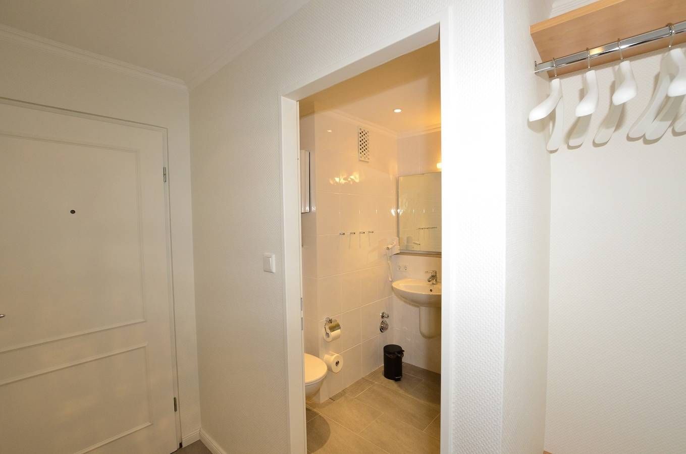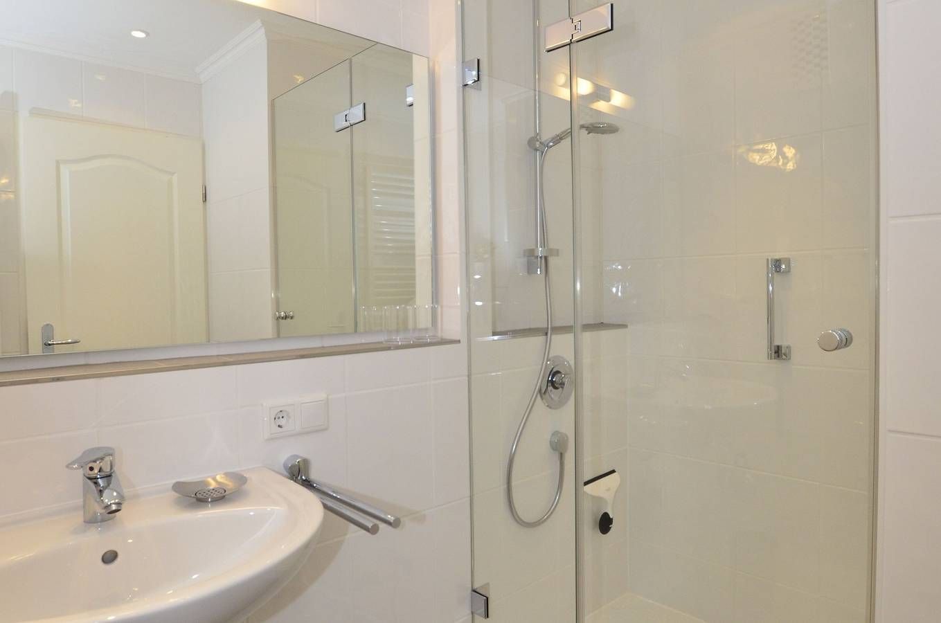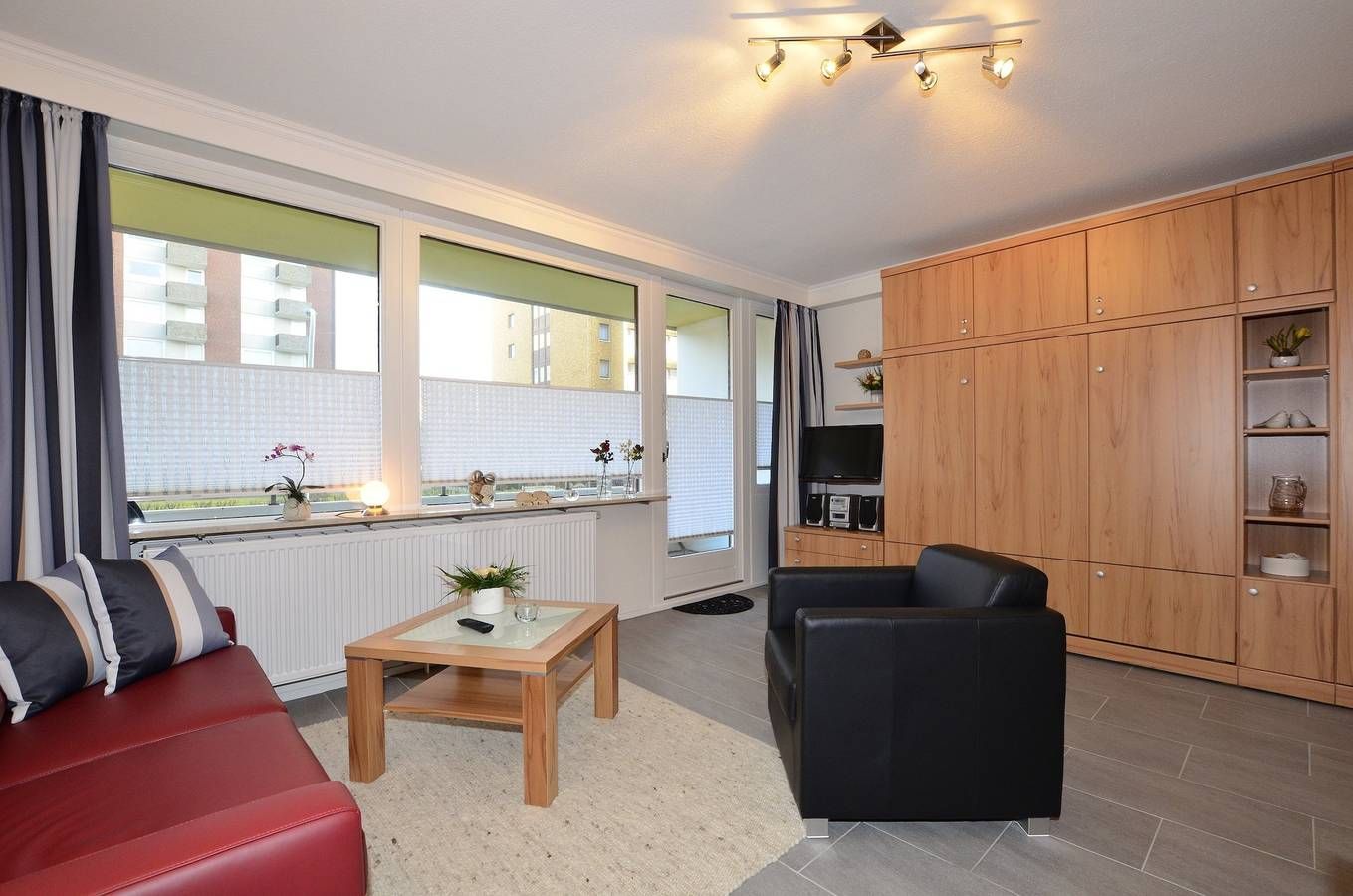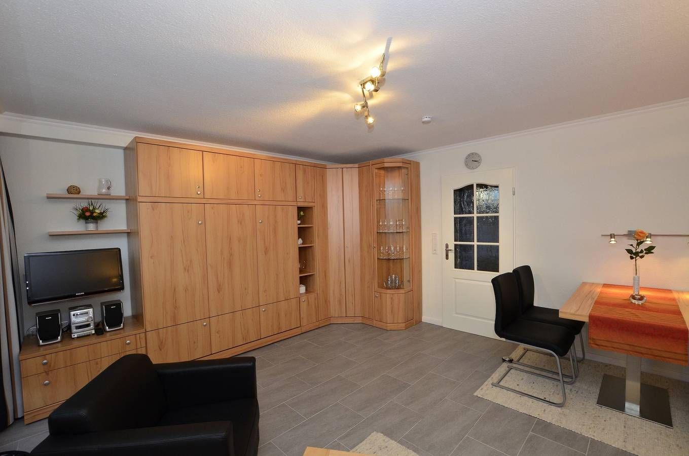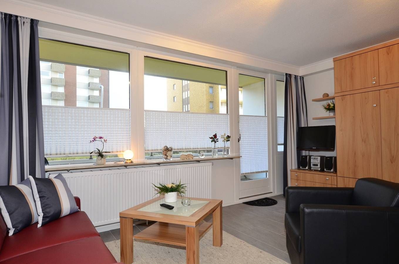 Großzügige 1-Zimmer-Ferienwohnung Besonders komfortable, mit großformatigen, schönen Fliesen ausgelegte 1-Zimmer-Nichtraucher-Ferienwohnung (ca. 36 qm) im Parterre zur Landseite mit Ostloggia (Morgensonne, mit Balkonmöbeln und Auflagen) für max. 2 Personen.[nbsp][nbsp] Vom Vorflur (mit Garderobe) gelangt man in das kombinierte Wohn-/Schlafzimmer (mit Austritt zum Balkon), in die separate Küche und in das moderne, neue Duschbad/WC. Der Wohn-/Schlafraum besteht aus einer gemütlichen Sitzgarnitur (2-Sitzer-Couch und ein Sessel), einem Essplatz, Doppelschrankbetten, einem Kabel-Flachbild-TV, Radio/CD. Die separate Küche hat einen Geschirrspüler, eine Mikrowelle (mit Grillfunktion), ein Cerankochfeld und einen Kühlschrank mit 3*-Gefrierfach. Kaffeemaschine, Wasserkocher und Toaster gehören zur Grundausstattung. Im Bad befinden sich eine Dusche, ein WC, ein Waschtisch, ein Handtuchtrockner und ein Fön. Haustiere dürfen nicht mitgebracht werden. Eine Duplex-Garage kann für 8,00 €/Tag oder ein PKW-Außenstellplatz für 14,00 €/Tag mit gebucht werden (begrenztes Kontingent!). Im Haus befindet sich ein kostenloses W-Lan-Netz, das für alle Appartements zugänglich ist.