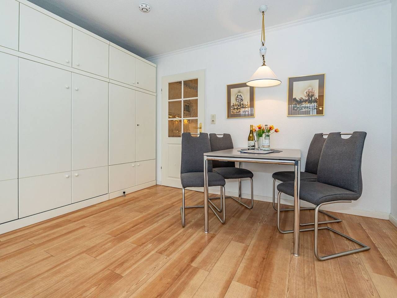 1-Zimmer-Nichtraucher-Ferienwohnung (ca. 32 qm) in der 1. Etage zur Seeseite mit Westloggia (Nachmittagssonne, mit Balkonmöbeln und Auflagen) für max. 2 Personen. Vom Vorflur mit Garderobe und Küchenzeile gelangt man in das kombinierte Wohn-/Schlafzimmer (mit Austritt zum Balkon) und in das Wannenbad/WC. Der Wohn-/Schlafraum mit Laminatboden besteht aus einer Sitzgarnitur (2-Sitzer-Couch, 2 Sessel), einem Doppelschrankbett (einzeln klappbar), Essplatz, Kabel-Flachbild-TV und kostenloser Internetnutzung per W-Lan. Die neue Küchenzeile hat einen Geschirrspüler, eine Mikrowelle und ein Ceranfeld mit 4 Kochstellen. Kaffeemaschine, Wasserkocher und Toaster gehören zur Grundausstattung. Im Bad befinden sich eine Dusche, ein WC, ein Waschtisch und ein Handtuchtrockner. Stellplatz zu buchbar Eine Duplex-Garage kann für 8,00€/Tag oder ein PKW-Außenstellplatz für 14,00 €/Tag mit gemietet werden (begrenztes Kontingent!). Haustiere sind willkommen! Bei Mitbringen eines Haustieres erhöht sich der Tagespreis um 5,00 € pro Haustier zzgl. einer einmaligen Endreinigungspauschale von 10,00 € pro Haustier auf die übliche Endreinigung. Im Haus befindet sich ein kostenloses W-Lan-Netz, das für alle Appartements zugänglich ist.