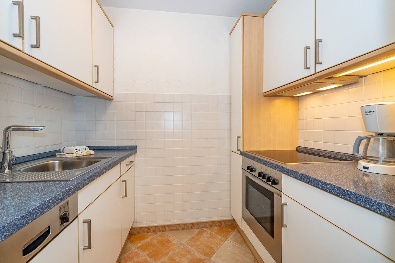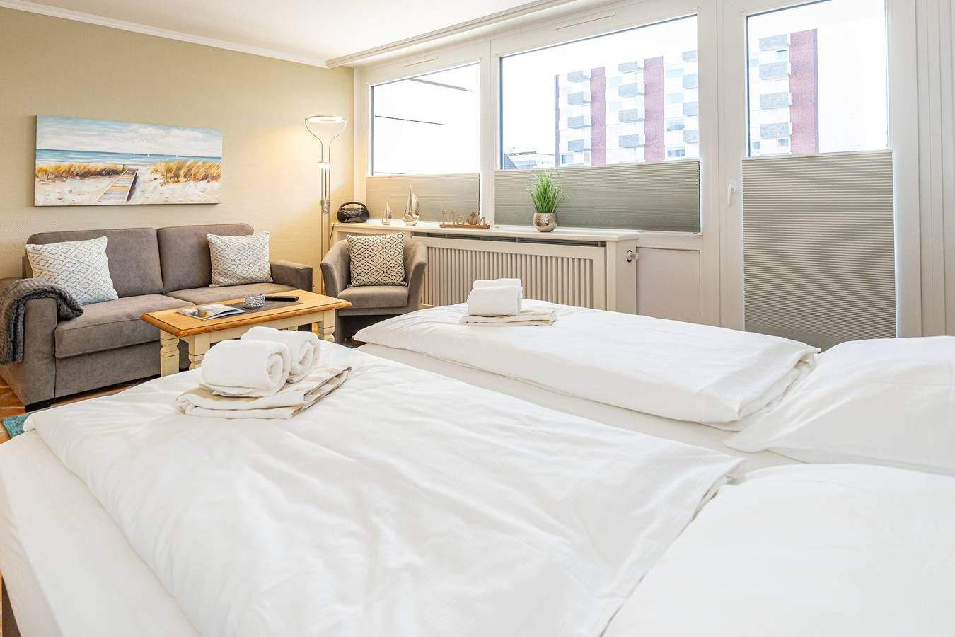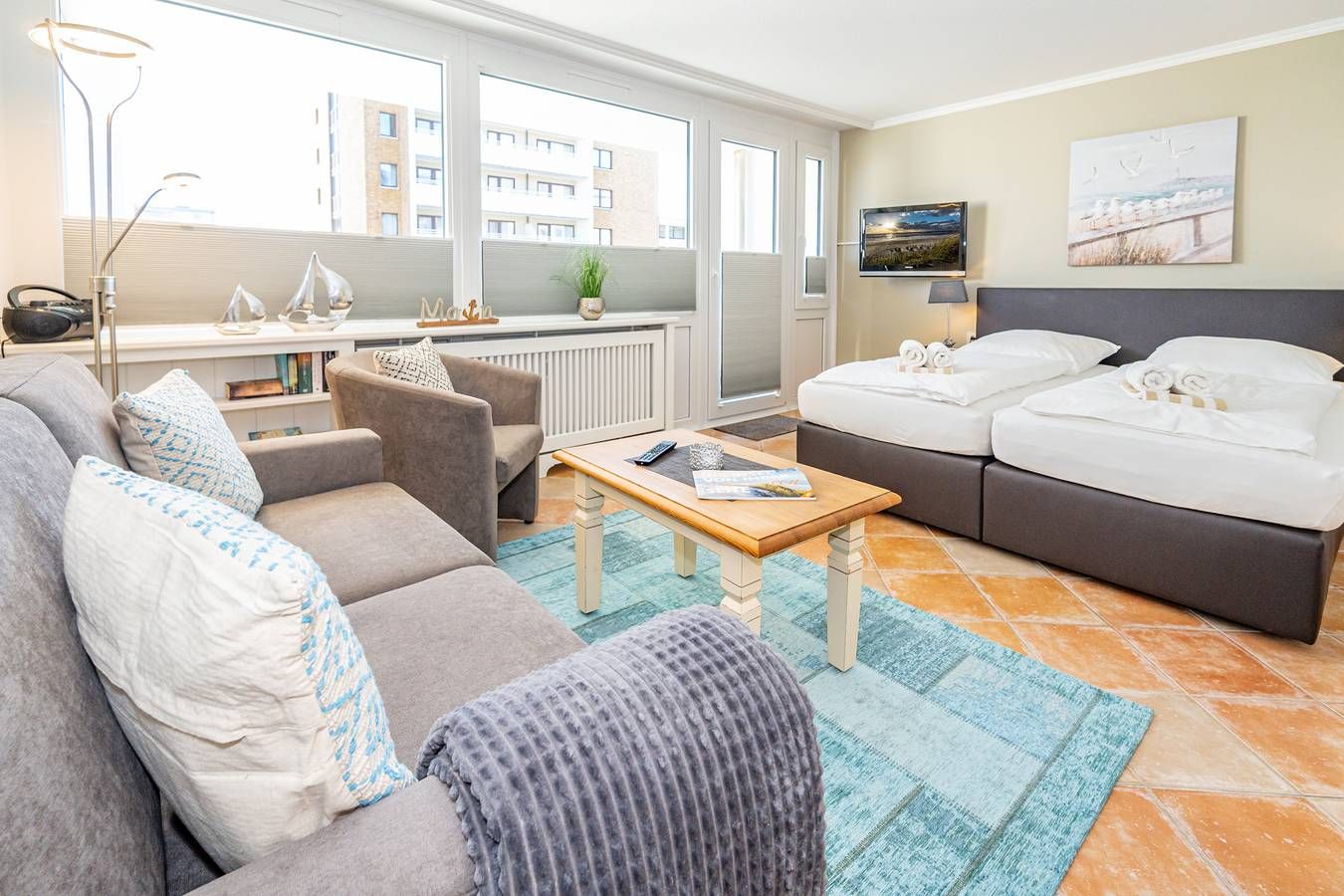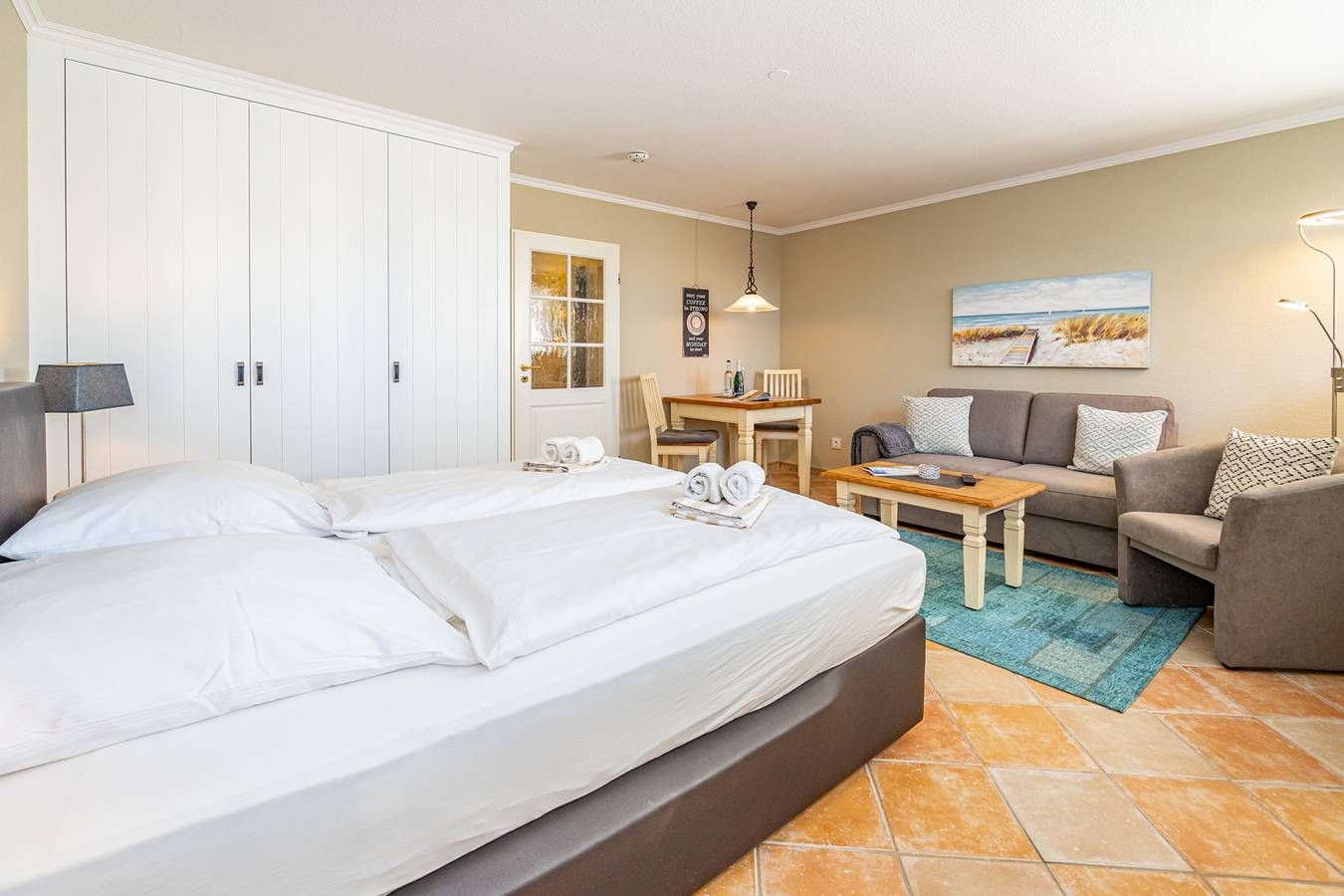 Großzügige City-Ferienwohnung mit feststehendem Doppelbett! Komfortable, komplett mit Fliesen ausgelegte 1-Zimmer-Nichtraucher-Ferienwohnung (ca. 38 qm) in der 1. Etage zur Landseite mit Ostloggia (Morgensonne, Balkonmöbel vorhanden) für max. 2 Personen. Vom Vorflur (mit Garderobe) gelangt man in das kombinierte Wohn-/Schlafzimmer (mit Austritt zum Balkon), in die separate Küche und in das neue Duschbad/WC. Der Wohn-/Schlafraum besteht aus einer gemütlichen Sitzgarnitur (Zweisitzer und einem Sessel mit Fußhocker), einem neues Boxspringbett (zwei Einzelmatratzen), einem Essplatz, Kabel-Flachbild-TV, Radio. Die separate Küche hat einen Geschirrspüler, einen Herd mit Backofen, ein Cerankochfeld und einen Kühlschrank mit 3*-Gefrierfach. Kaffeemaschine, Wasserkocher und Toaster gehören zur Grundausstattung. Das neue, helle Badezimmer ist mit einer Dusche mit extraflachem Einstieg, einem Waschtisch, ein WC und einem festinstallierten Fön ausgestattet. Eine Duplex-Garage kann für 8,00 €/Tag oder ein PKW-Außenstellplatz für 14,00 €/Tag mit gebucht werden (begrenztes Kontingent!). Im Haus befindet sich ein kostenloses W-Lan-Netz, das für alle Appartements zugänglich ist.