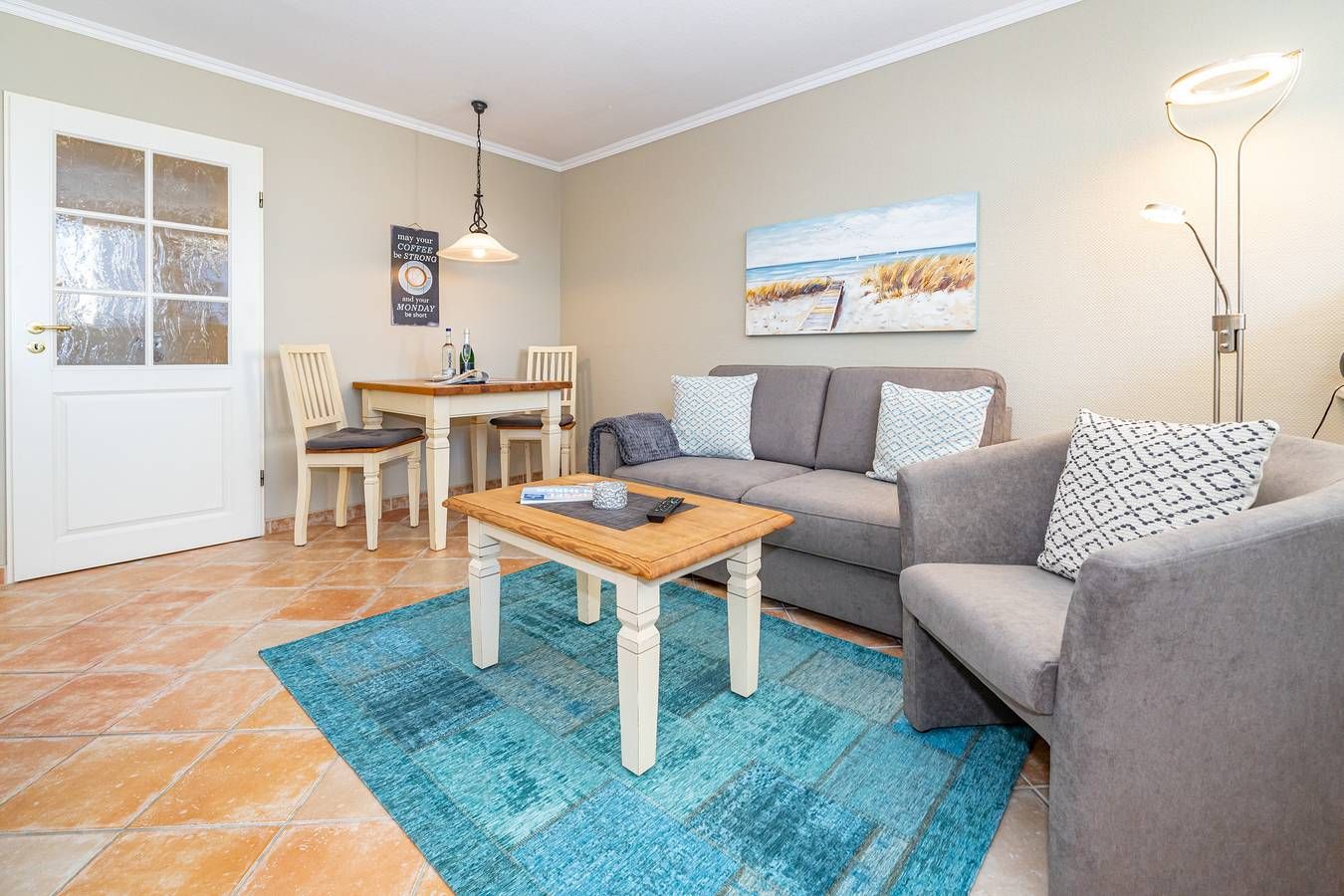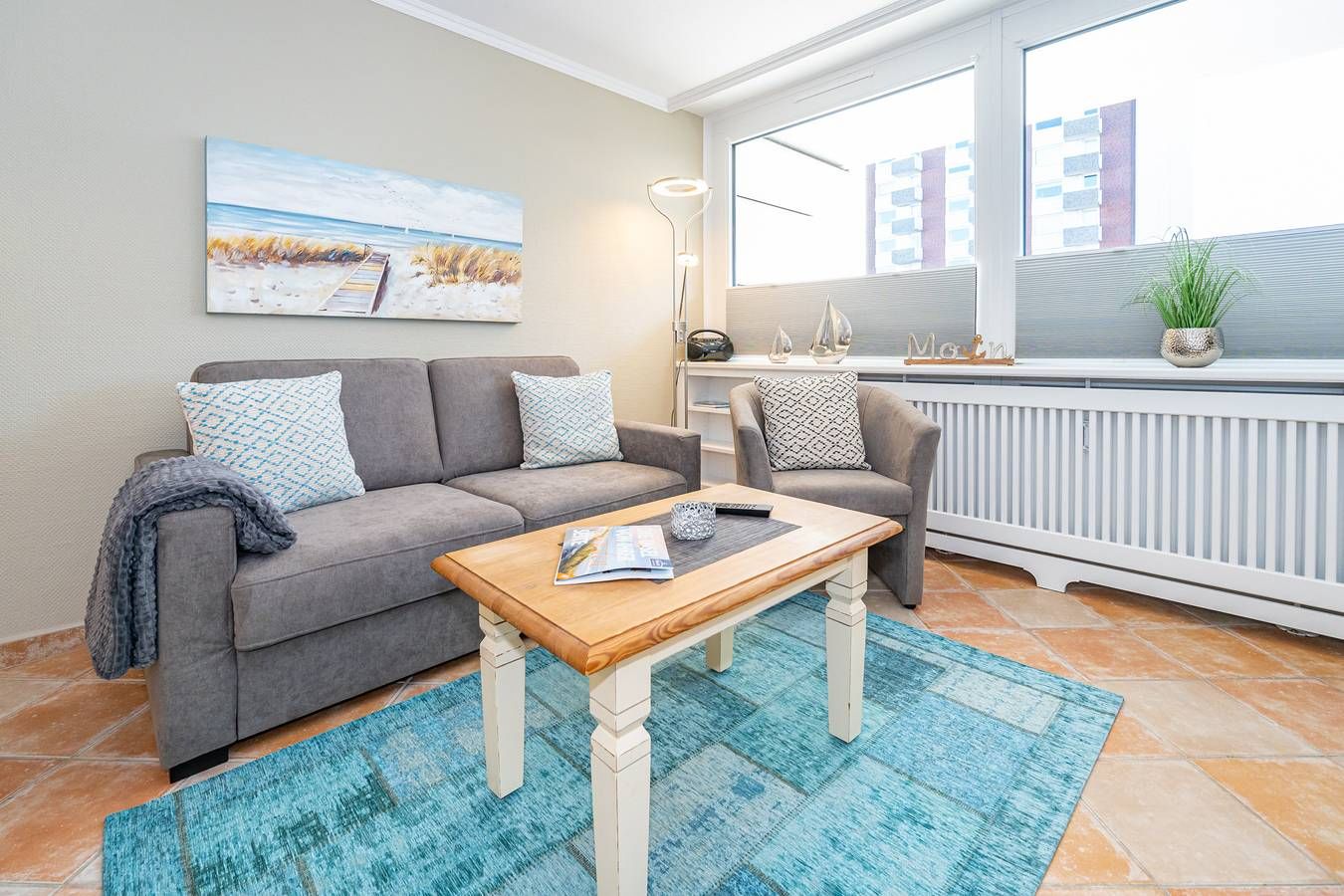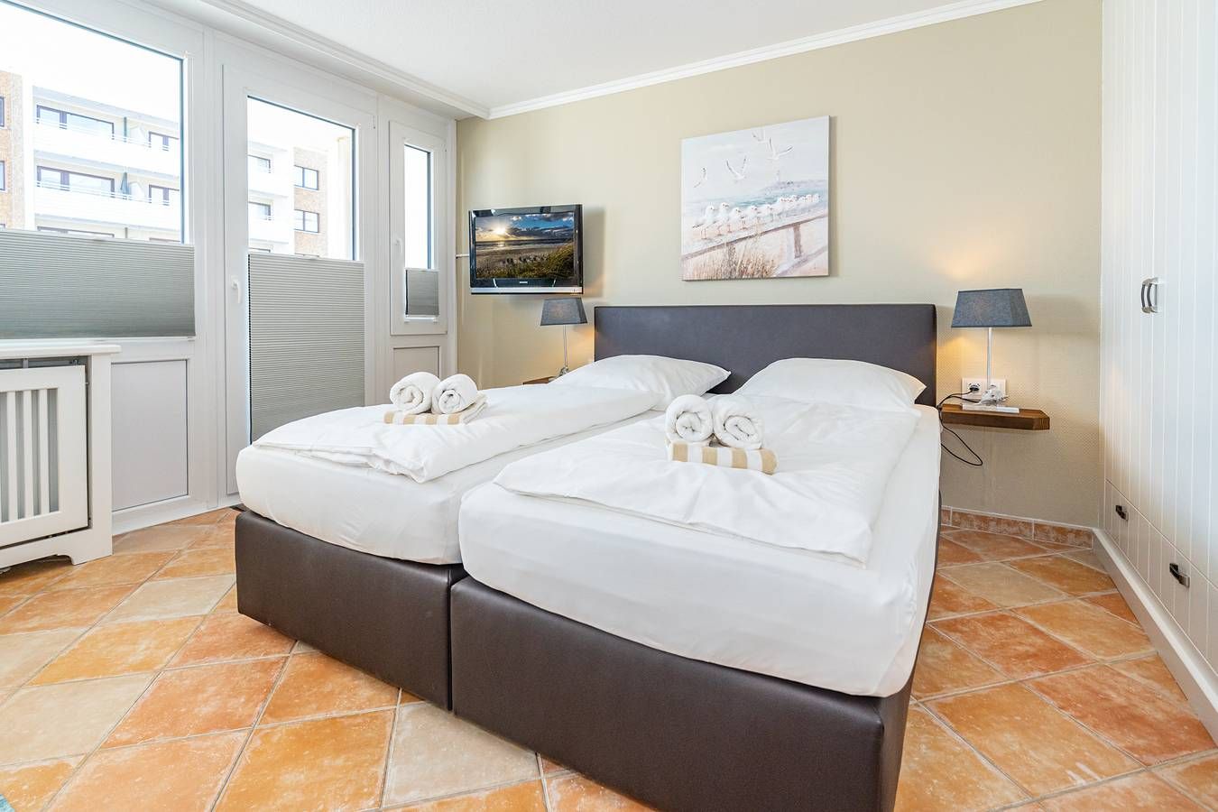 Großzügige City-Ferienwohnung mit feststehendem Doppelbett! Komfortable, komplett mit Fliesen ausgelegte 1-Zimmer-Nichtraucher-Ferienwohnung (ca. 38 qm) in der 1. Etage zur Landseite mit Ostloggia (Morgensonne, Balkonmöbel vorhanden) für max. 2 Personen. Vom Vorflur (mit Garderobe) gelangt man in das kombinierte Wohn-/Schlafzimmer (mit Austritt zum Balkon), in die separate Küche und in das neue Duschbad/WC. Der Wohn-/Schlafraum besteht aus einer gemütlichen Sitzgarnitur (Zweisitzer und einem Sessel mit Fußhocker), einem neues Boxspringbett (zwei Einzelmatratzen), einem Essplatz, Kabel-Flachbild-TV, Radio. Die separate Küche hat einen Geschirrspüler, einen Herd mit Backofen, ein Cerankochfeld und einen Kühlschrank mit 3*-Gefrierfach. Kaffeemaschine, Wasserkocher und Toaster gehören zur Grundausstattung. Das neue, helle Badezimmer ist mit einer Dusche mit extraflachem Einstieg, einem Waschtisch, ein WC und einem festinstallierten Fön ausgestattet. Eine Duplex-Garage kann für 8,00 €/Tag oder ein PKW-Außenstellplatz für 14,00 €/Tag mit gebucht werden (begrenztes Kontingent!). Im Haus befindet sich ein kostenloses W-Lan-Netz, das für alle Appartements zugänglich ist.