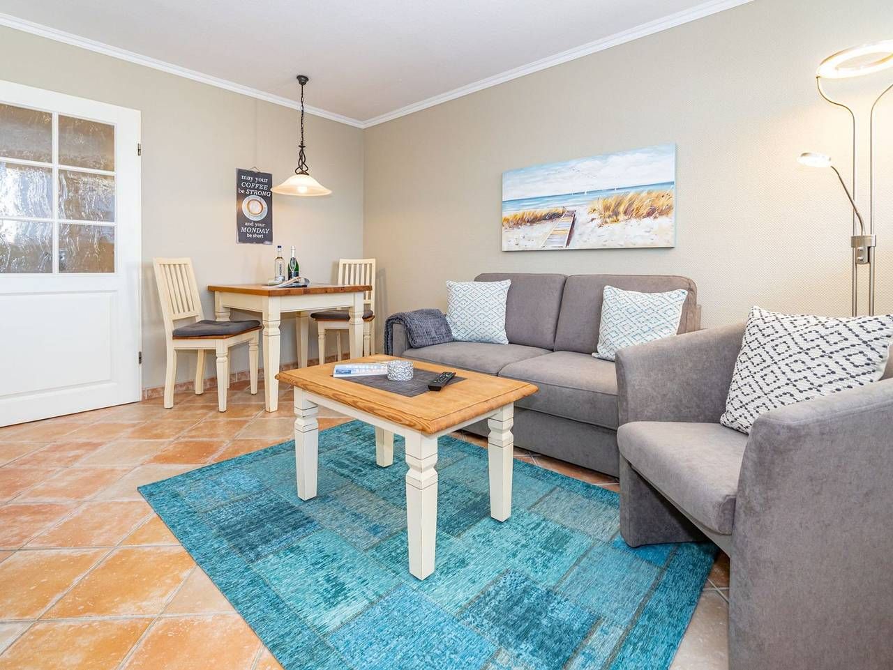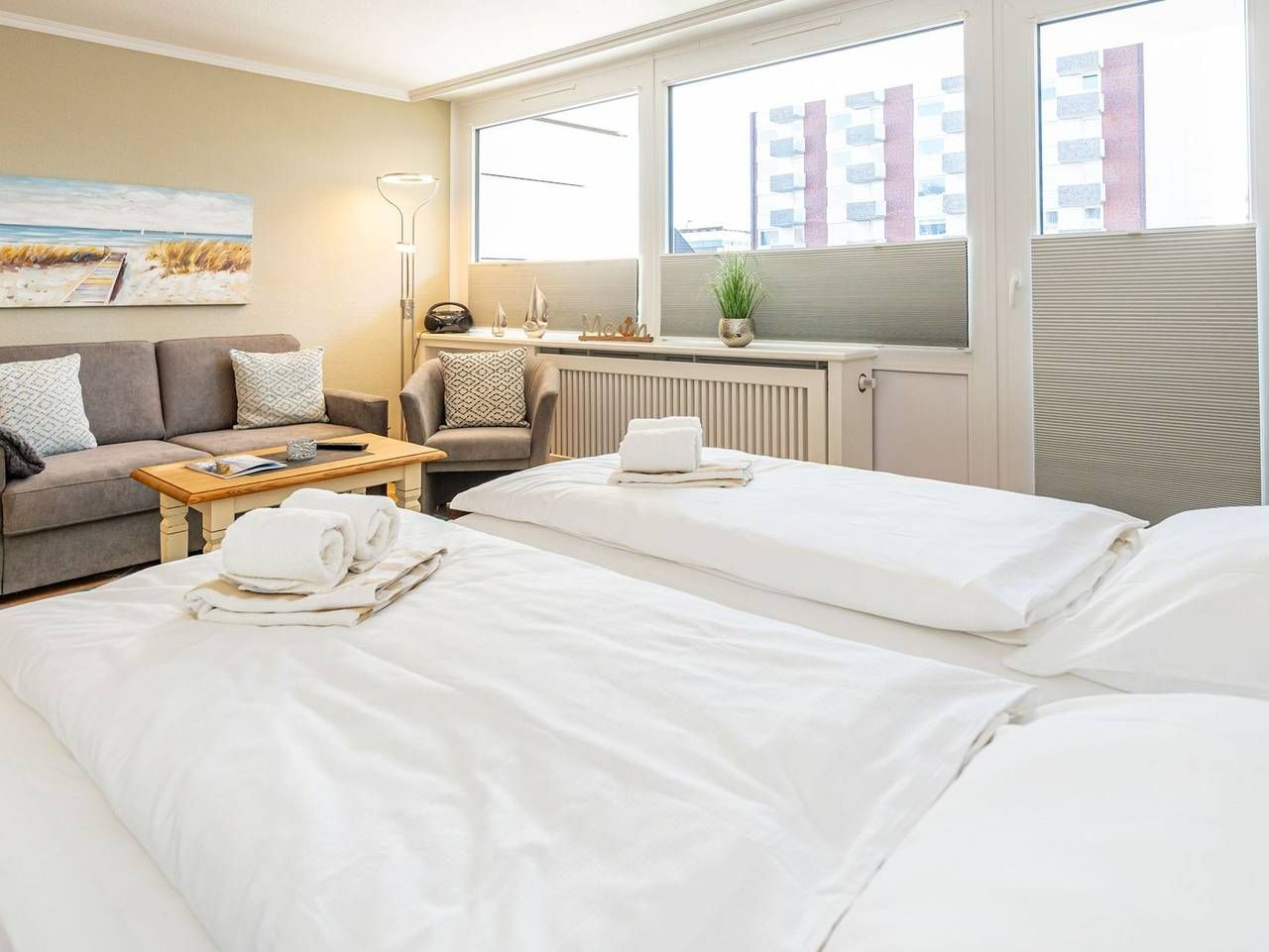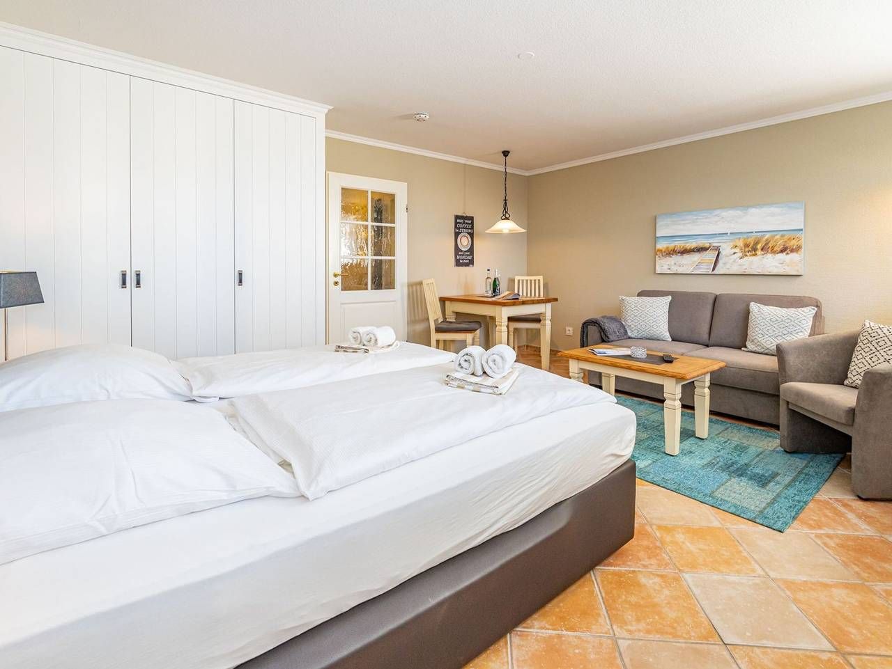 Großzügige City-Ferienwohnung mit feststehendem Doppelbett! Komfortable, komplett mit Fliesen ausgelegte 1-Zimmer-Nichtraucher-Ferienwohnung (ca. 38 qm) in der 1. Etage zur Landseite mit Ostloggia (Morgensonne, Balkonmöbel vorhanden) für max. 2 Personen. Vom Vorflur (mit Garderobe) gelangt man in das kombinierte Wohn-/Schlafzimmer (mit Austritt zum Balkon), in die separate Küche und in das neue Duschbad/WC. Der Wohn-/Schlafraum besteht aus einer gemütlichen Sitzgarnitur (Zweisitzer und einem Sessel mit Fußhocker), einem neues Boxspringbett (zwei Einzelmatratzen), einem Essplatz, Kabel-Flachbild-TV, Radio. Die separate Küche hat einen Geschirrspüler, einen Herd mit Backofen, ein Cerankochfeld und einen Kühlschrank mit 3*-Gefrierfach. Kaffeemaschine, Wasserkocher und Toaster gehören zur Grundausstattung. Das neue, helle Badezimmer ist mit einer Dusche mit extraflachem Einstieg, einem Waschtisch, ein WC und einem festinstallierten Fön ausgestattet. Eine Duplex-Garage kann für 8,00 €/Tag oder ein PKW-Außenstellplatz für 14,00 €/Tag mit gebucht werden (begrenztes Kontingent!). Im Haus befindet sich ein kostenloses W-Lan-Netz, das für alle Appartements zugänglich ist.