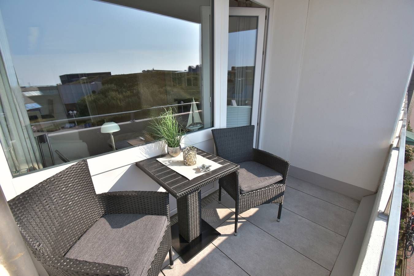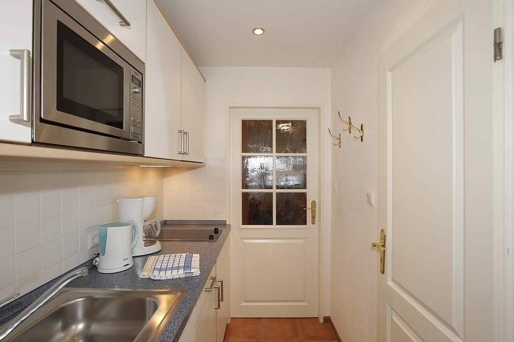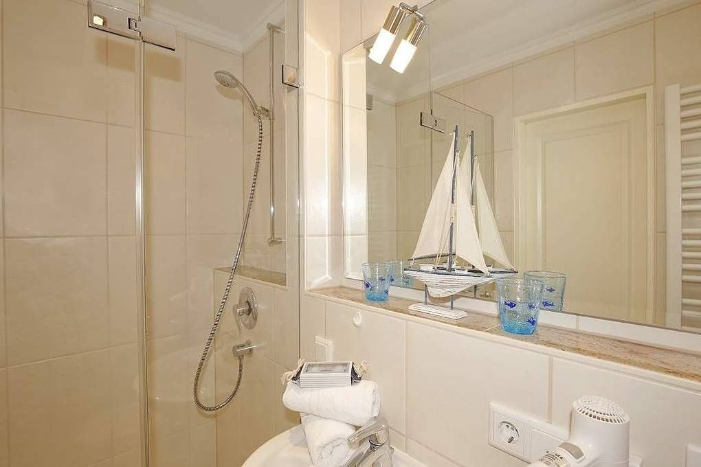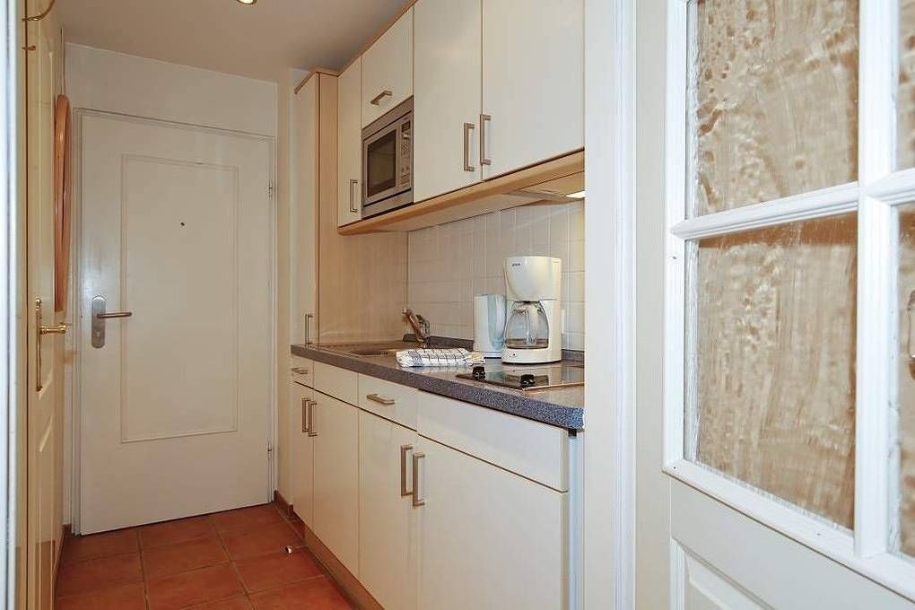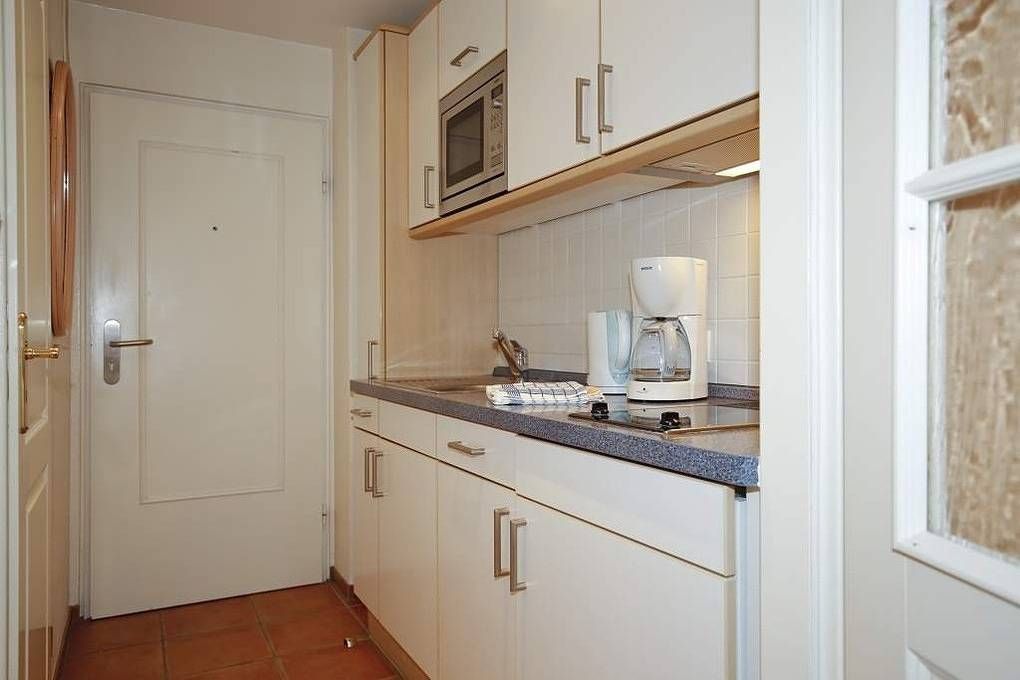 Schicke City-Ferienwohnung zur Seeseite mit kleinem Meerblick! Die liebevoll ausgestattete 1-Zimmer-Ferienwohnung, Nichtraucher, ca. 25 qm, in der 2. Etage mit Westloggia (Nachmittagssonne, mit Balkonmöbeln und Auflagen) ist mit 1-2 Personen belegbar. Vom Vorflur mit Garderobe und neuer Einbau-Küchenzeile gelangt man in das kombinierte Wohn-/Schlafzimmer (mit Austritt zur geschützten komplett sanierten Loggia) und in das Duschbad/WC. Der Wohn-/Schlafraum besteht aus 2 gemütlichen Cocktail-Sesseln, hochwertigen Doppelschrankbetten (einzeln klappbar), separatem Essplatz, Flachbild-TV (32 Zoll mit USB-Anschluss), HiFi-Anlage. Die helle Küchenzeile hat eine Mikrowelle (mit Grillfunktion), ein Cerankochfeld und einen Kühlschrank mit 3-Sterne-Gefrierfach. Kaffeemaschine, Kapselmaschine, Wasserkocher und Toaster gehören zur Grundausstattung. Eine Duplex-Garage kann für 8,00 €/Tag oder ein PKW-Außenstellplatz für 14,00 €/Tag mit gebucht werden (begrenztes Kontingent!). Haustiere sind hier leider nicht gestattet. Im Haus befindet sich ein kostenloses W-Lan-Netz, das für alle Appartements zugänglich ist.