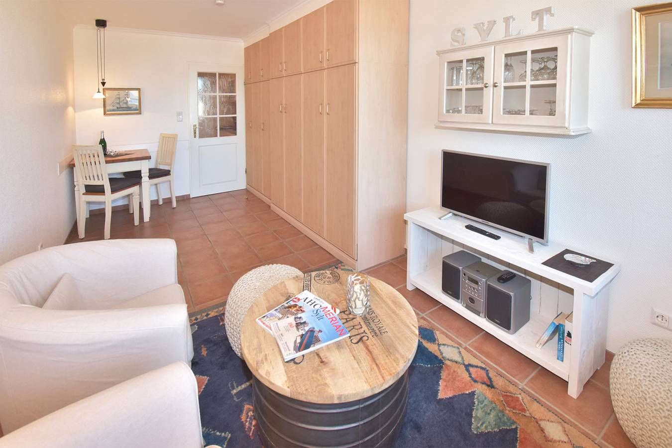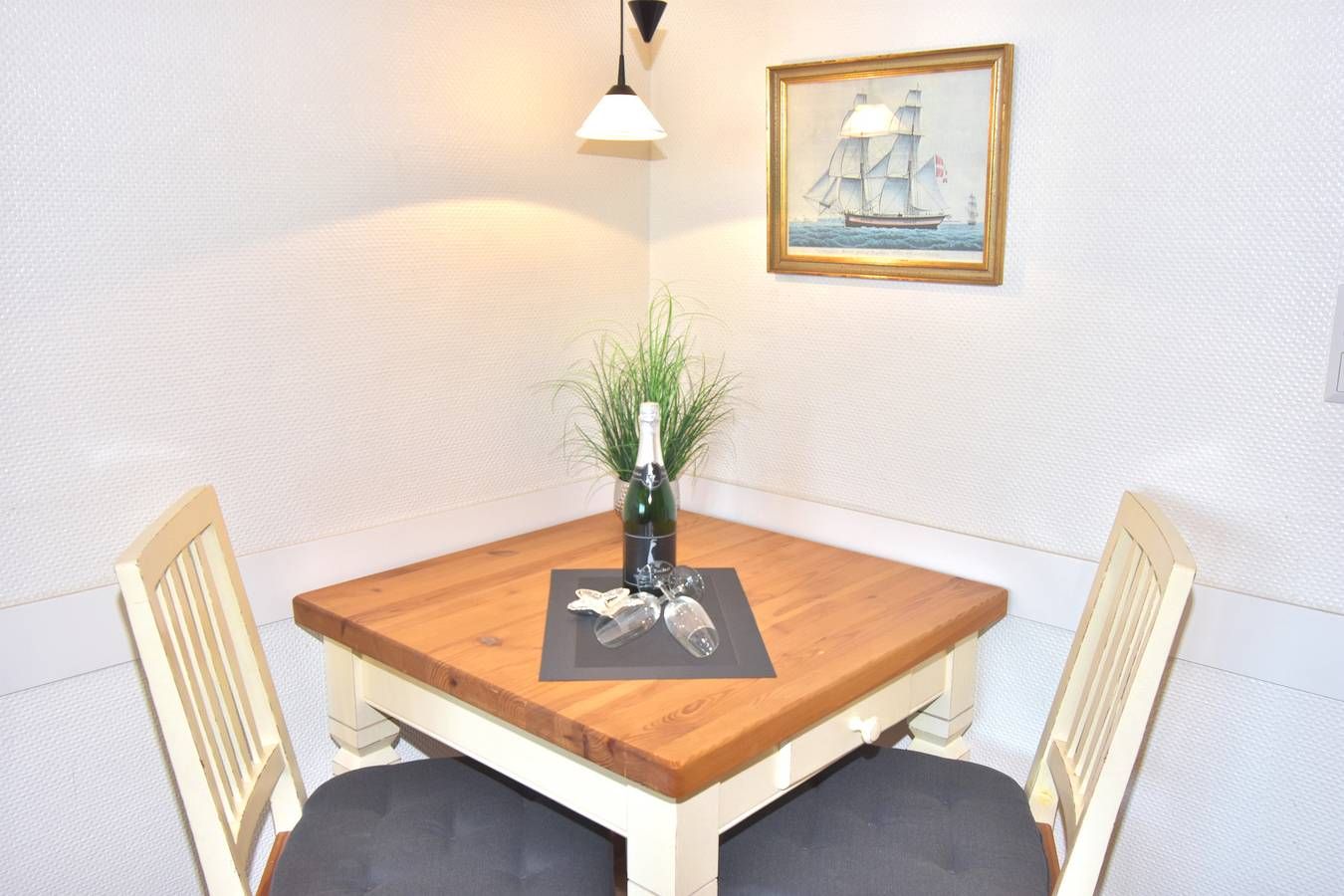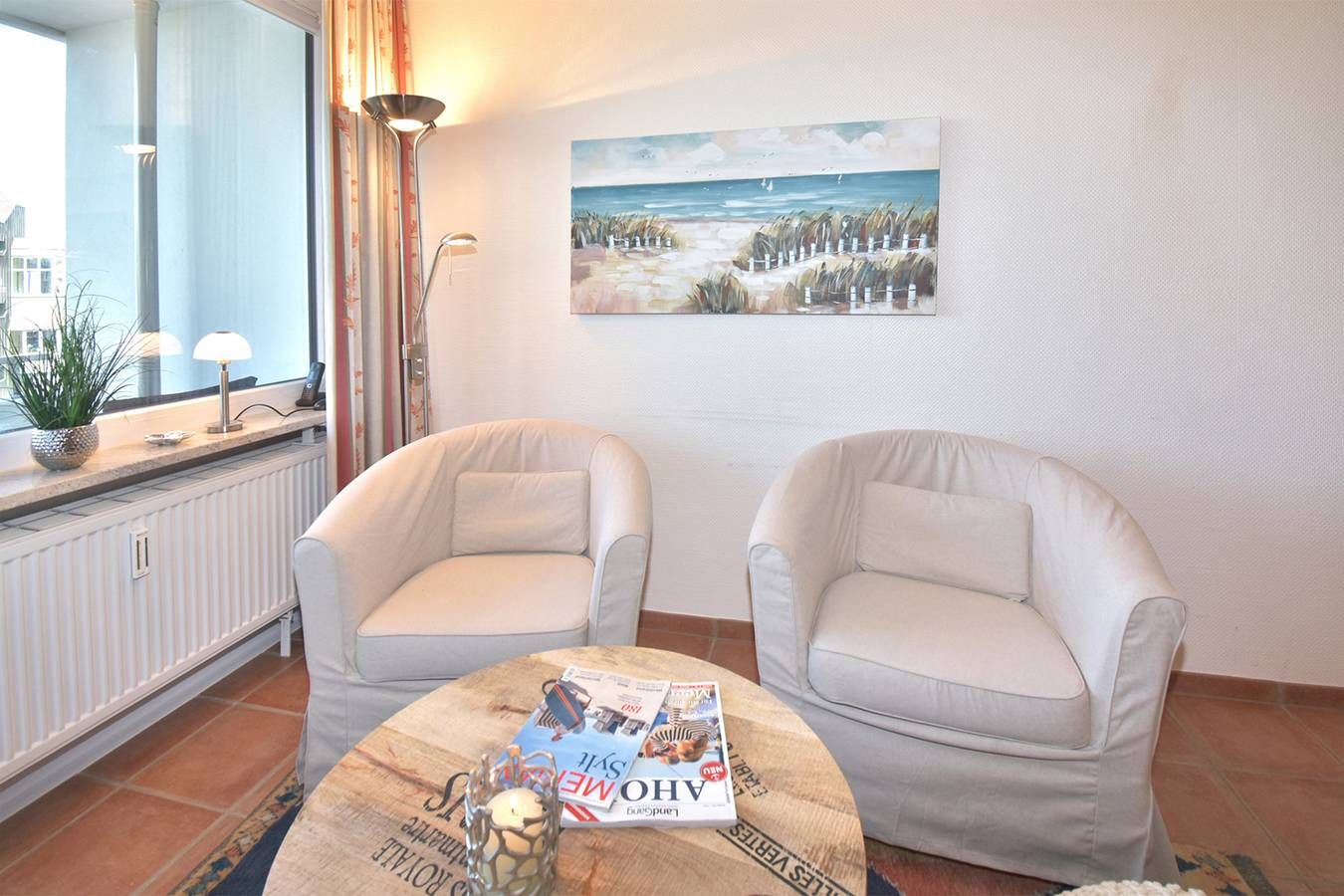Schicke City-Ferienwohnung zur Seeseite mit kleinem Meerblick! Die liebevoll ausgestattete 1-Zimmer-Ferienwohnung, Nichtraucher, ca. 25 qm, in der 2. Etage mit Westloggia (Nachmittagssonne, mit Balkonmöbeln und Auflagen) ist mit 1-2 Personen belegbar. Vom Vorflur mit Garderobe und neuer Einbau-Küchenzeile gelangt man in das kombinierte Wohn-/Schlafzimmer (mit Austritt zur geschützten komplett sanierten Loggia) und in das Duschbad/WC. Der Wohn-/Schlafraum besteht aus 2 gemütlichen Cocktail-Sesseln, hochwertigen Doppelschrankbetten (einzeln klappbar), separatem Essplatz, Flachbild-TV (32 Zoll mit USB-Anschluss), HiFi-Anlage. Die helle Küchenzeile hat eine Mikrowelle (mit Grillfunktion), ein Cerankochfeld und einen Kühlschrank mit 3-Sterne-Gefrierfach. Kaffeemaschine, Kapselmaschine, Wasserkocher und Toaster gehören zur Grundausstattung. Eine Duplex-Garage kann für 8,00 €/Tag oder ein PKW-Außenstellplatz für 14,00 €/Tag mit gebucht werden (begrenztes Kontingent!). Haustiere sind hier leider nicht gestattet. Im Haus befindet sich ein kostenloses W-Lan-Netz, das für alle Appartements zugänglich ist.