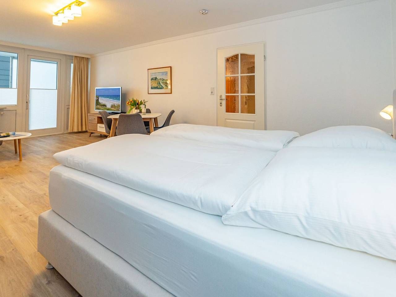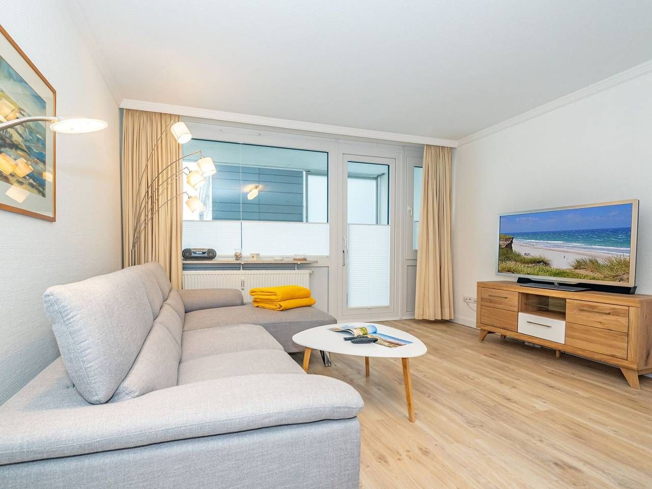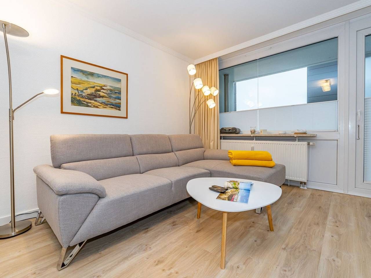 Frisch renovierte großzügige City-Ferienwohnung mit Meerblick! Gemütliche und großzügige 1-Zimmer-Nichtraucher-Ferienwohnung (ca. 44 qm) in der 3. Etage mit Nordloggia und Meerblick (mit Balkonmöbeln und Auflagen) für max. 2 Personen. Vom Vorflur mit Garderobe gelangt man in das kombinierte Wohn-/Schlafzimmer (mit Austritt zum Balkon), die neue Küche und das neue, moderne Duschbad/WC. Das gut geschnittene Zimmer besteht aus einer komfortablen Couch, einem Essplatz, einem Doppelpolsterbett (zwei Einzelmatratzen und Topper), Kabel-Flachbild-TV. Die[nbsp] Küche hat einen Geschirrspüler, ein Cerankochfeld, eine Mikrowelle und ein Kühlschrank mit 3*-Gefrierfach. Kaffeemaschine, Wasserkocher und Toaster gehören zur Grundausstattung. Im[nbsp] modernen Bad befinden sich eine flache Dusche, ein WC, ein Bidet, ein Waschtisch, ein Handtuchtrockner und ein Fön. Eine Duplex-Garage kann für 8,00 €/Tag oder ein PKW-Außenstellplatz für 14,00 €/Tag mit gebucht werden (begrenztes Kontingent!). Haustiere sind nicht gestattet! Im Haus befindet sich ein kostenloses W-Lan-Netz, das für alle Appartements zugänglich ist.