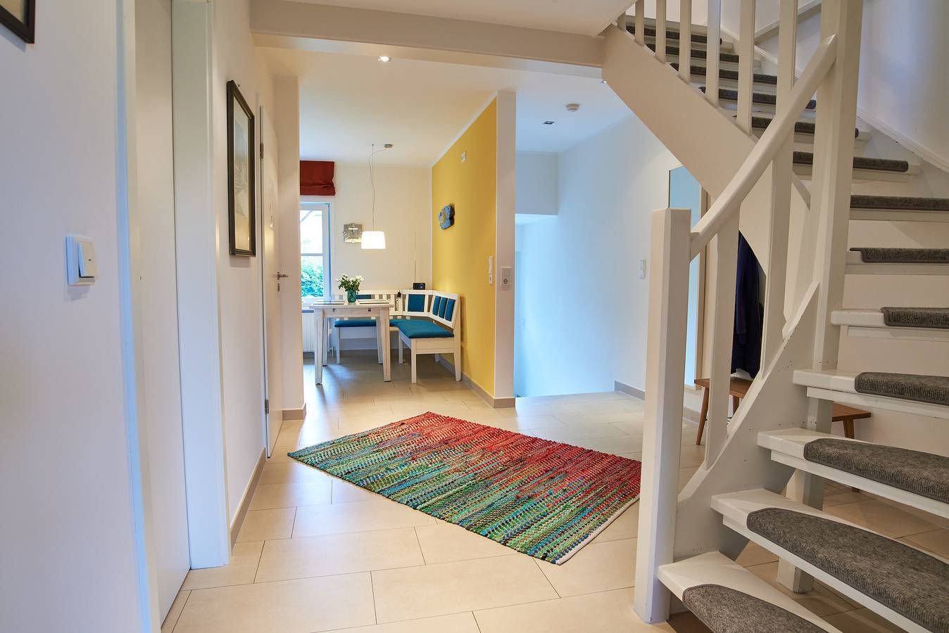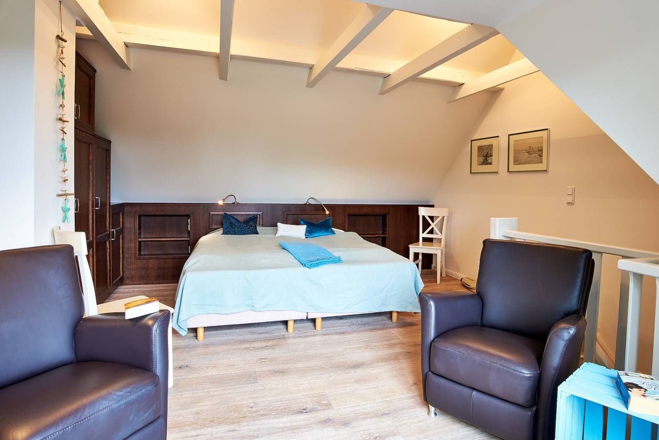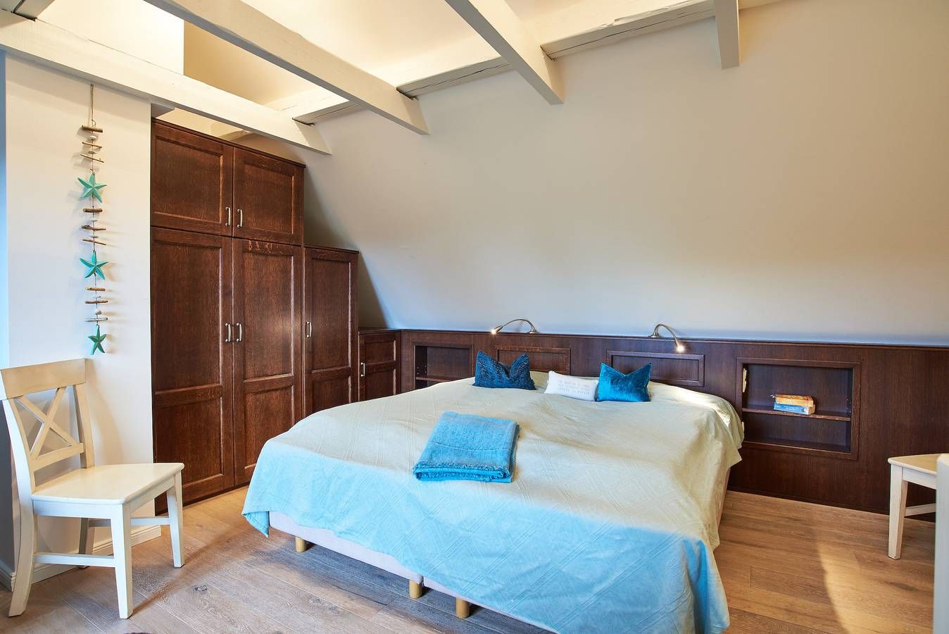 In idyllischen Friesendörfchen Nieblum liegt unser charmantes Domizil Wildrose mit einer schönen Dachterrasse und einem kleinen Garten. Mitten im Herzen des wunderschönen und idyllischen Ortes Nieblum, welcher unter vielen Liebhabern der Insel als schönster Ort auf Föhr gilt, befindet sich dieses Juwel nur wenige Meter entfernt vom schön angelegten und gepflegten Nieblumer Ententeich. Nieblum ist ein kleines Inseldorf, nur ca. 5 Km von der Stadt Wyk entfernt und bietet alles, was man zum täglichen Bedarf benötigt. Es gibt einen kleinen Einkaufsladen, eine Bäckerei mit hervorragenden Brötchen, Broten und süßen Gaumenfreuden, mehrere Restaurants und Cafes, eine unter den Föhrern sehr beliebte Eisdiele und natürlich einen schönen Strand mit Surfschule. Und genau in diesem hübschen Dorf liegt unsere Haushälfte Wildrose mit seinen 65 qm. Schon beim Betreten des Hauses werden Sie die offene und großzügige Bauweise der Doppelhaushälfte bemerken. Der geräumige Flur bietet reichlich Platz und von hier führt eine Treppe hinauf in den Schlafbereich, welcher mit der offenen Balkenlage, den dunklen, edlen Möbeln im Kontrast zum hell gestalteten Raum sogleich Gemütlichkeit ausstrahlt. Zugleich befindet sich im Schlafraum neben dem Boxspringbett (160x200cm) eine weitere Sitzgruppe zum Lesen, Fernsehschauen, Telefonieren oder einfach zum Entspannen und Zurückziehen. Von hier aus gelangen Sie auch auf die große Dachterrasse, die im Sommer (ca. April bis Ende September Anfang Oktober) mit Gartenmöbeln zum Verweilen einlädt. Die übrigen Räume befinden sich im Erdgeschoss der Wohnung und sind, ebenso wie das Schlafzimmer, farblich harmonisch aufeinander abgestimmt und mit hochwertigen Möbeln ausgestattet. Genießen Sie Ihre Urlaubstage und Relaxen Sie im behaglich eingerichteten Wohnzimmer mit internetfähigem TV und Bluetooth-fähiger Anlage mit CD und Radio. Hier befindet sich ein ausziehbares Schlafsofa mit einer Liegefläche von 140x200 cm für einen dritten Gast oder als Ausweichmöglichkeit. In der seitlichen Bettbox sind Decken und Kissen schnell verstaut, um in den Tag zu starten. Probieren Sie sich an friesischen Rezepten, denn in der voll ausgestatteten, offenen Küche macht Kochen richtig Freude. Das wunderschöne Bad mit riesigem Spiegel, Handtuchheizkörper und hochwertiger Dusche lässt Sie gut in den Tag starten. Am Haus befindet sich ein PKW-Stellplatz und im Garten eine weitere Sitzecke. Die Wildrose bietet Gästen einen zusätzlichen Aufenthaltsraum im Keller, der von außen begehbar ist. Hier steht Ihnen ein vollwertiges Badezimmer und eine Sauna mit Aufenthaltsraum und Sitzgruppe zur Verfügung sowie die kostenfreie Nutzung von Waschmaschine und Trockner. Diese Annehmlichkeiten erhöhen den Komfort und die Flexibilität während ihres Aufenthalts. Ihr Hund (max. 2) ist bei uns ebenfalls in der Wildrose willkommen. Verbringen Sie Ihren Urlaub in dieser bezaubernden Haushälfte im idyllischen Nieblum und schauen Sie gleich nach, ob Ihr Wunschtermin noch verfügbar ist. Die Eigentümerin stellt einen Grill zur Verfügung, solange dieser von den Gästen pfleglich behandelt und nach Gebrauch gereinigt wird. Bei Auswahl eines Kinderreisebetts wird dieses anstelle eines normalen Bettes bezogen. Sollten Sie das Kinderreisebett zusätzlich benötigen, buchen Sie bitte ein weiteres Wäschepaket hinzu, da wir nur bezogene Kinderreisebetten verleihen. Im vom außen begehbaren im Keller liegenden Zusatzraum befindet sich noch ein zusätzliches Vollbad mit Dusche und Ruheraum. Hier befindet sich auch die Sauna. ---------------------------------------- 2025: Infos zum Wäschepaket (obligatorisch): Unser Wäschepaket besteht aus der bezogenen Bettwäsche, 1 Duschtuch, 2 Handtüchern, 1 Geschirrtuch und einem Badvorleger und gehört obligatorisch zur Buchung dazu. Ab 21 Übernachtungen bieten wir auf Wunsch einen kostenfreien Wäschewechsel an. Zusätzlich können Handtücher und Duschtücher optional nach Bedarf einzeln hinzugebucht werden. Ab 2026 mehr Flexibilität und Individualität: Das bekannte Wäschepaket ist nicht mehr buchbar. Die Bettwäsche bleibt aus hygienischen Ansprüchen eine obligatorische Serviceleistung. Sie finden die Betten weiterhin bezogen vor. Doch Hand- und Duschtücher können Sie künftig entweder selbst mitbringen oder auf eigenen Wunsch einzeln optional hinzubuchen. Diese Variante ist aus betrieblichen Gründen erst für Buchungen in 2026 buchbar und entspricht dem Gästewunsch laut Umfrage nach mehr Flexibilität, Individualität und Nachhaltigkeit! Infos zum Präsentkorb Föhrer Inselkäse für 2 oder 4 Personen (Inhalte nicht austauschbar) Der Föhrer Präsentkorb für 4 Personen enthält: 200g Föhrer Naturkäse, 200g roten Föhrer Fruchtaufstrich, 430g Alkersumer Gemüsetopf, 6 Stangen (ca. 160g) Wattwürmer, 150g Landleberwurst , 125ml Föhrer Chutney und 0,33l Föhrer Biar. Der Föhrer Präsentkorb für 2 Personen enthält: 200g Föhrer Bärlauch-Käse, 200g Föhrer Fruchtaufstrich Apfel-Zimt, 430g vegane Linsenbolognese und ca. 130g mildem Landschinken vom Schwein.