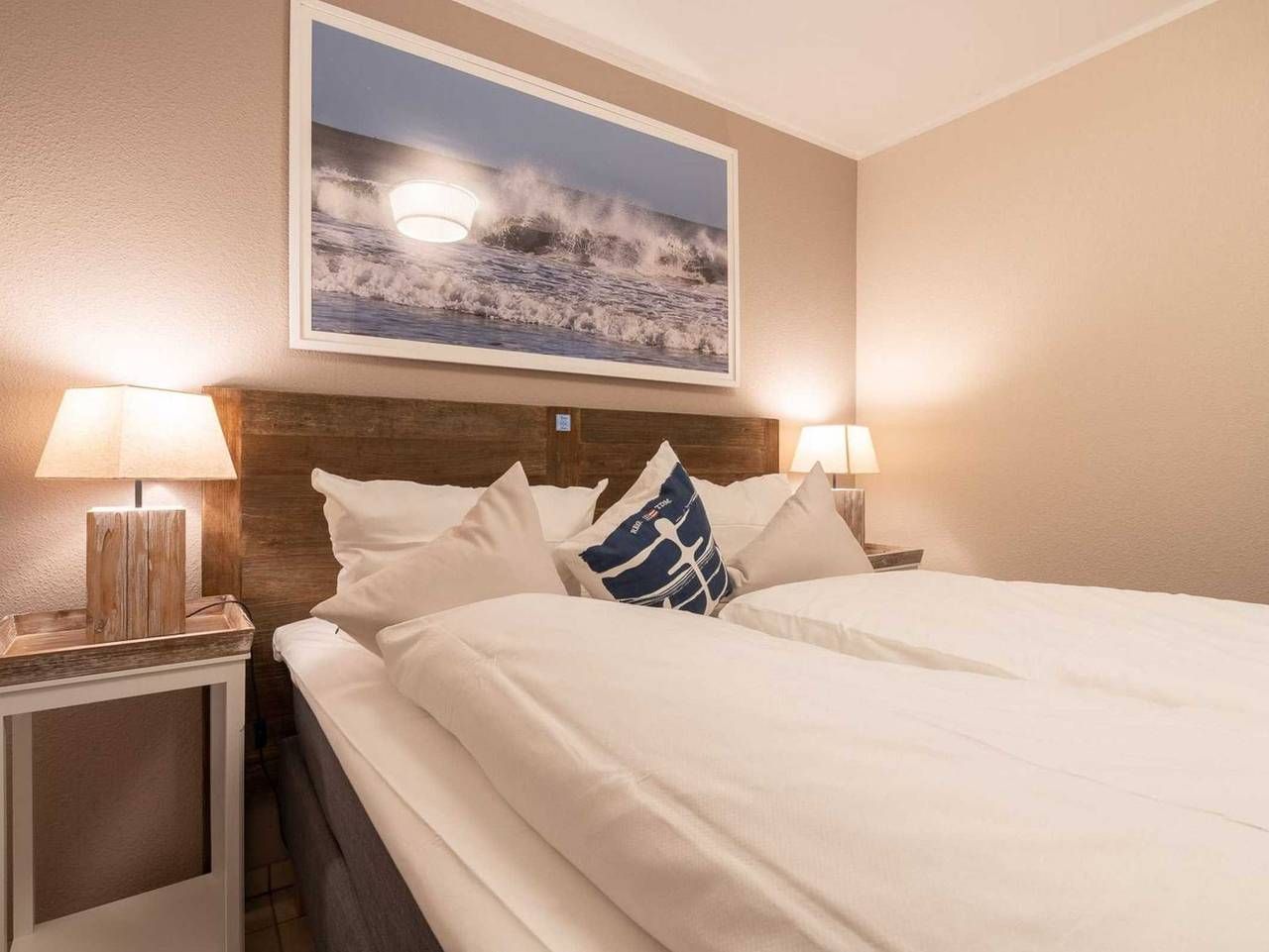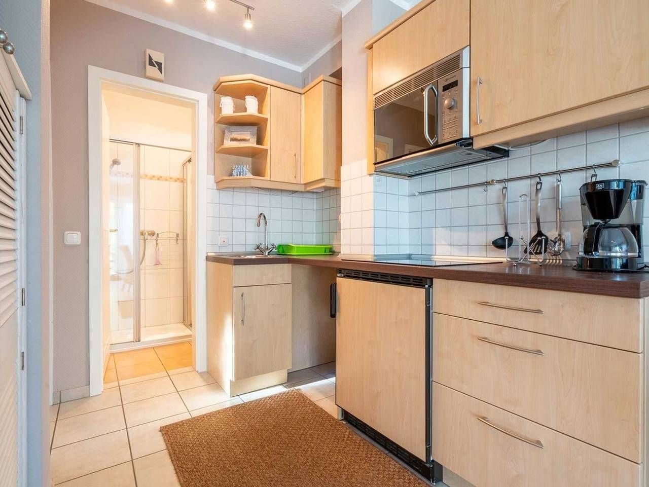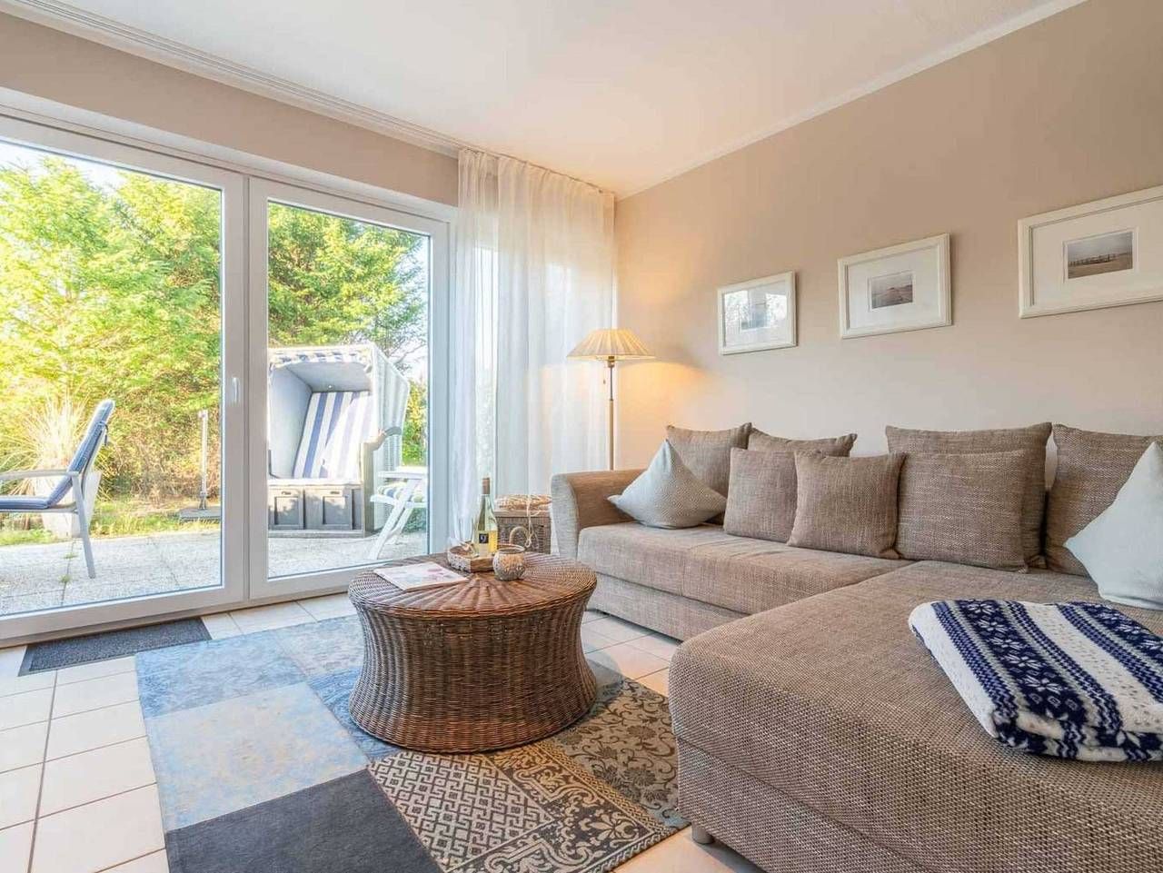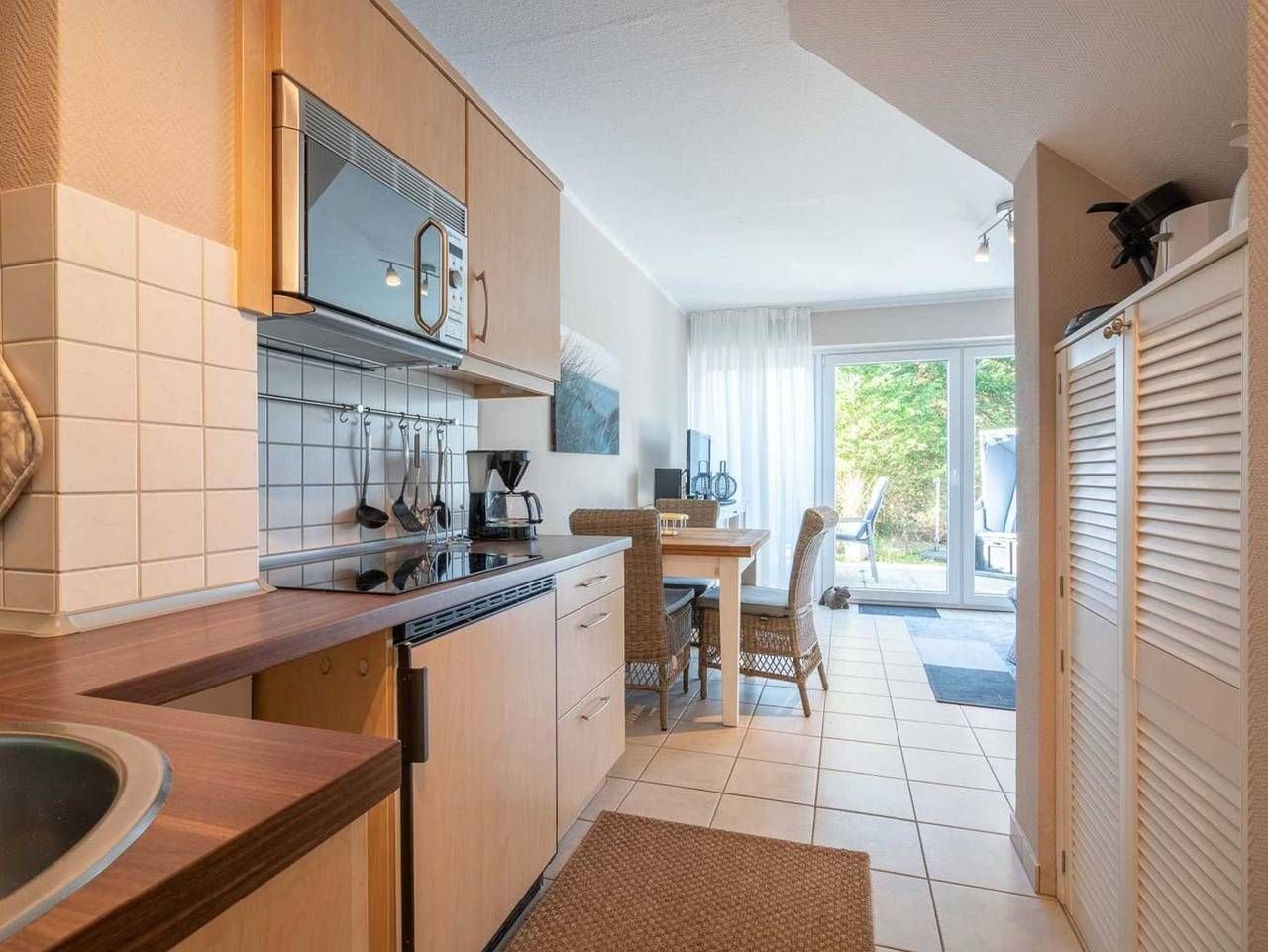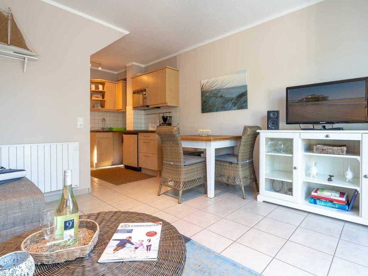 Modern. Ruhig. Mit Terrasse. Elegante 2-Zimmer-Ferienwohnung Dünensonne EG mit ca. 45 qm auf 1 Ebene (EG) für bis zu 2 Personen. In ruhiger, aber zentrumsnaher Lage im Ortsteil Dorf in St. Peter-Ording. Alle Geschäfte und Restaurants der Dorfstraße und auch der Seedeich sind in nur wenigen Gehminuten erreicht. Allergikerfreundliches Domizil ohne Teppichböden. Wohnzimmer mit großem (Schlaf-) Ecksofa (120x220cm), TV (Kabel), Stereoanlage und Esstisch mit 3 Stühlen. Direkter Zugang zur möblierten, windgeschützten Terrasse nach Südwesten mit Strandkorb. Offene Küche mit Kühlschrank mit Gefrierfach und Mikrowelle mit Grillfunktion. Schlafzimmer mit Doppelbett (2x 80x200cm), Kleiderschrank und Stuhl. Badezimmer (Duschbad) mit Dusche mit niedrigem Eintritt (ca. 5cm), WC, Heizlüfter und Föhn. Flur mit Garderobe und Spiegel im Eingangsbereich. Abstellnische mit Staubsauger vorhanden. Pkw-Stellplatz vor dem Haus. Überdachte Fahrradständer hinter dem Haus. Kostenloses WLAN. Die Bettwäsche wird gestellt. Handtücher können dazugebucht werden. Rauchen und Haustiere sind nicht erlaubt. Eine erstklassige Lage! In nur 5 Gehminuten erreichen Sie das Zentrum von St. Peter-Dorf (Dorfstraße) mit zahlreichen Einkaufsmöglichkeiten, Boutiquen, Restaurants, Cafés etc. Das Deichvorland beginnt keine 100 m von Ihrer Haustür entfernt und lädt zu ausgedehnten Spaziergängen in den Dünen oder Fahrradtouren auf dem Deich ein. Hier gelangen Sie auch zu Fuß zum Strand von St. Peter-Dorf. Die anderen Strände erreichen Sie mit dem Ortsbus (kostenlos mit der Gästekarte), Fahrrad oder Auto in wenigen Minuten. Alle volljährigen Mitreisenden sind kurabgabenpflichtig.