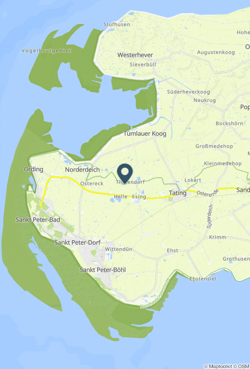 Hochwertige 2-Zimmer-Fewo. Naturnahe Lage. Kostenloses WLAN. Hochwertig. Naturnah. Hyggelig. Schöne, hochwertig eingerichtete 2-Zimmer-Ferienwohnung 'Südfall' im 'Friesenhof Hyggewarft' mit ca. 46 m² auf 1 Ebene (EG) für bis zu 2 Personen. Landestypisch unter Reet. In ruhiger, naturnaher Lage zwischen St. Peter-Ording und Tating, nur zehn Pkw-Minuten zum Strand und zum Zentrum von St. Peter-Ording. Ideal für einen erholsamen, entspannenden Urlaub. Zwei Hunde sind nach Anmeldung herzlich willkommen. Wohnzimmer mit Sofa, Sessel und SMART-TV. Separate Küche mit Backofen, Geschirrspüler, Kühlschrank (Gefriermöglichkeit im Gemeinschaftsraum) und Esstisch mit Sitzbank und 1 Stuhl. Schlafzimmer mit Doppelbett (160x200cm, Boxspring), Kleiderschrank und SMART-TV. Badezimmer (Duschbad) mit bodengleicher Dusche, WC, Tageslicht, beheiztem Spiegel und Föhn. Kleiner Flur mit Garderobe und Schuhschränkchen im Eingangsbereich. Im Gemeinschaftsraum im Haus stehen Esstische und ein großer Tielkühlschrank sowie ein großes SMART-TV für gesellige Momente zur Verfügung. Auf dem gepflegten Grundstück sind ausreichend Pkw-Stellplätze, eine überdachte Fahrradabstellmöglichkeit, verschiedene gemeinschaftliche Sonnenfreisitze mit Strandkörben sowie eine Außensauna (kostenpflichtig) für bis zu 6 Personen vorhanden. Ein großer eingezäunter Hundeauslauf kann genutzt werden. Zwei Elektro-Pkw-Ladestationen sind vorhanden und können vor Ort gebucht werden (kostenpflichtig). Die Bettwäsche wird gestellt. Handtücher können dazugebucht werden. Rauchen ist nicht erlaubt. - Willkommen in Tating, einem malerischen Dorf vor den Toren von St. Peter-Ording auf der Halbinsel Eiderstedt. Hier erleben Sie die unvergleichliche Schönheit der nordfriesischen Landschaft und können die Ruhe und Gelassenheit der Umgebung in vollen Zügen genießen. Bitte beachten Sie, dass eine eventuell anfallende Kurabgabe nicht im Gesamtpreis enthalten ist. Diese ist vor Ort zu leisten.