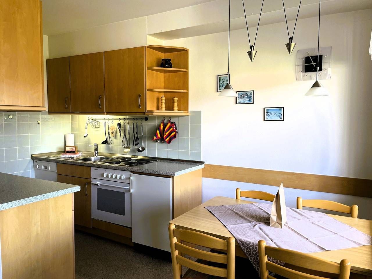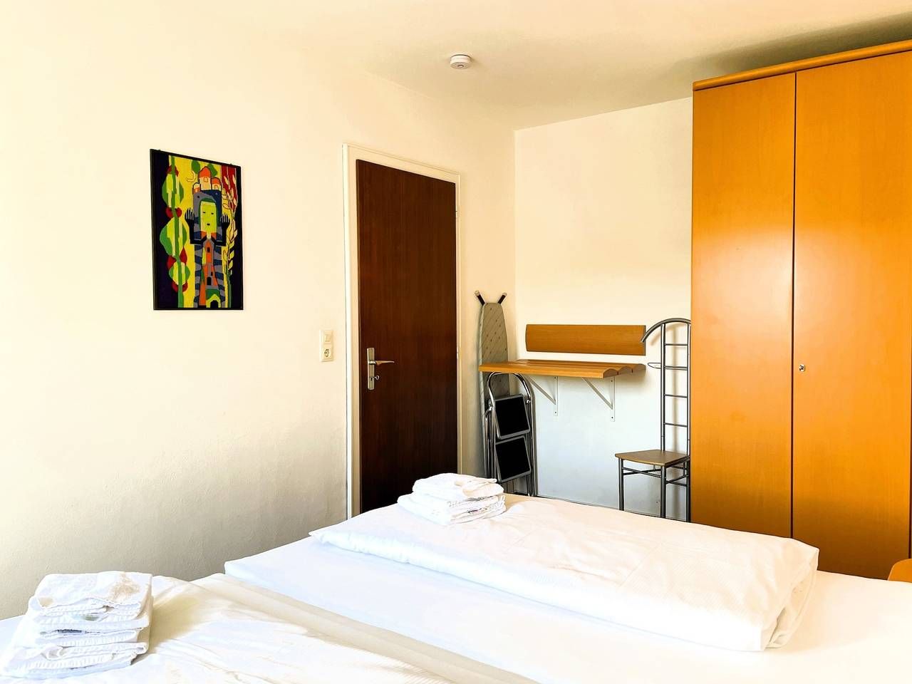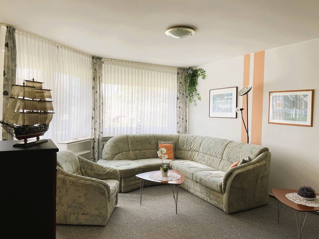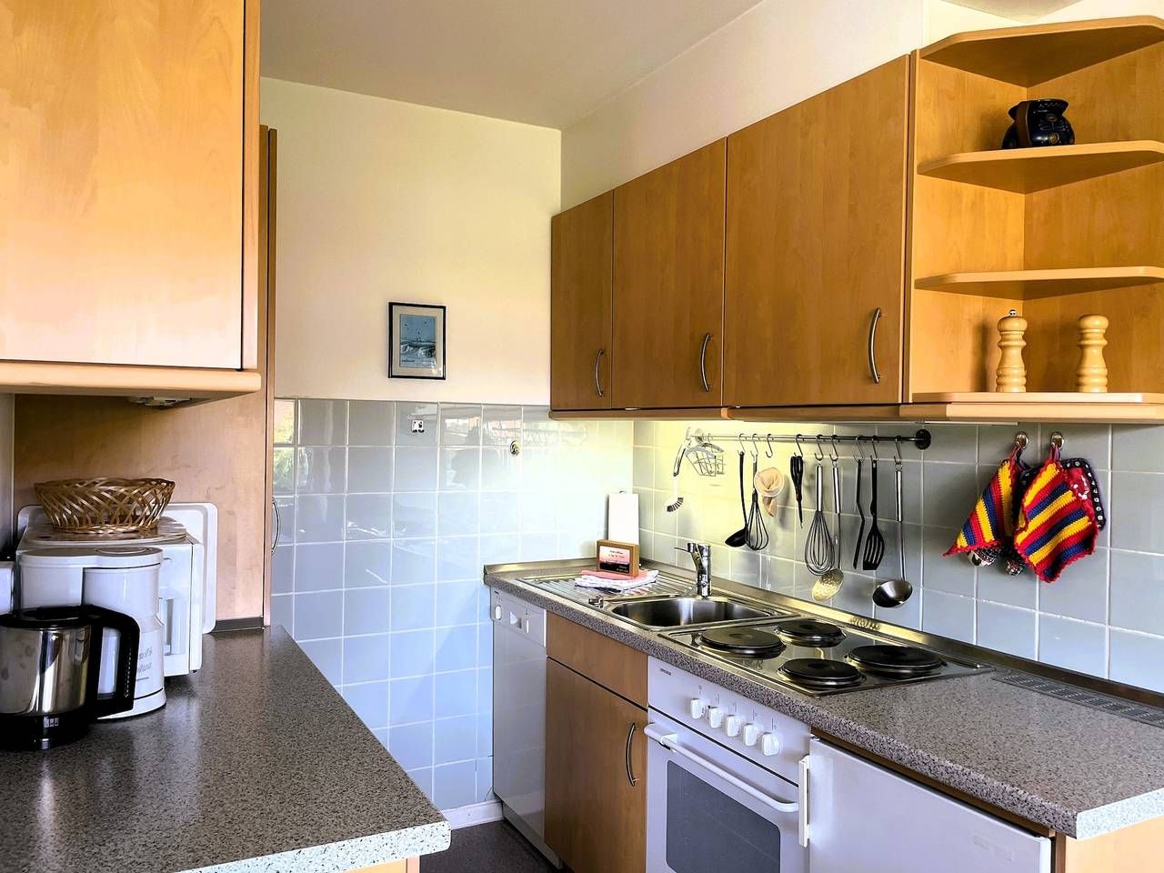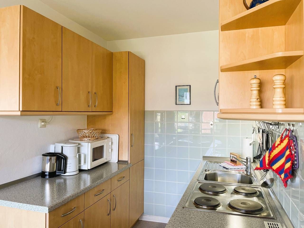 In ruhiger Lage am Hasenkamp in Wyk befindet sich unsere Ferienwohnung Wolff. Alle wichtgen Einkaufsmöglichkeiten und einige Restaurants befinden sich im näheren Umfeld. Urlaub in Wyk auf Föhr? Dann buchen Sie jetzt diese gemütliche Ferienwohnung. Genießen Sie Ihren Urlaub auf 50 m² mit ausreichend Platz für bis zu 2 Personen. Ihr Feriendomizil Wolff finden Sie in einer ruhigen Anliegerstraße, sie ist ca. 500 m vom begehrten Wyker Südstrand und ca. 5 Fahrradminuten von der Innenstadt entfernt. Die Wohnung befindet sich im 1. Stock, eines Mehrfamilienhauses, das von viel Grün umgeben ist. Auf ca. 50 qm stehen Ihnen ein kleiner Flur mit Garderobe, ein Schlafzimmer mit Doppelbett, Wannenbad,WC mit Fenster und ein großzügiger Wohn-Essbereich mit integrierter Einbauküche zur Verfügung. Das Wohnzimmer bietet einen gemütlichen Essplatz und den direkten Zugang auf Ihren Süd-Balkon mit Blick auf den Garten. Für Ihre Unterhaltung sorgen hier WLAN, SAT-TV, Radio und eine kleine Auswahl an Büchern. Im Schlafzimmer finden Sie ein Doppelbett vor (2,0 m x 2,0m mit verstellbarem Lattenrost), das für eine angenehme Ruhe sorgt. Die moderne Küche ist komplett eingerichtet. Zu der Ausstattung gehören Geschirrspüler, Mikrowelle, Elektro-Herd mit Backofen, Kühlschrank, Kaffeemaschine, Wasserkocher, Toaster, Geschirr, Besteck, Töpfe usw. Sämtliche Einkaufsmöglichkeiten und einige Restaurants sind im unmittelbaren Umfeld zu finden. Zur Ferienwohnung gehört ein PKW-Stellplatz. Fahrräder können am Haus im Fahrradständer oder im Fahrradkeller abgestellt werden Es erwartet Sie ein kleines und gemütlich eingerichtetes Feriendomizil! Das Sofa kann ausgezogen werden und als Ausweichmöglichkeit genutzt werden (Liegefläche 150 x200 cm) ---------------------------------------- 2025: Infos zum Wäschepaket (obligatorisch): Unser Wäschepaket besteht aus der bezogenen Bettwäsche, 1 Duschtuch, 2 Handtüchern, 1 Geschirrtuch und einem Badvorleger und gehört obligatorisch zur Buchung dazu. Ab 21 Übernachtungen bieten wir auf Wunsch einen kostenfreien Wäschewechsel an. Zusätzlich können Handtücher und Duschtücher optional nach Bedarf einzeln hinzugebucht werden. Ab 2026 mehr Flexibilität und Individualität: Das bekannte Wäschepaket ist nicht mehr buchbar. Die Bettwäsche bleibt aus hygienischen Ansprüchen eine obligatorische Serviceleistung. Sie finden die Betten weiterhin bezogen vor. Doch Hand- und Duschtücher können Sie künftig entweder selbst mitbringen oder auf eigenen Wunsch einzeln optional hinzubuchen. Diese Variante ist aus betrieblichen Gründen erst für Buchungen in 2026 buchbar und entspricht dem Gästewunsch laut Umfrage nach mehr Flexibilität, Individualität und Nachhaltigkeit! Infos zum Präsentkorb Föhrer Inselkäse für 2 oder 4 Personen (Inhalte nicht austauschbar) Der Föhrer Präsentkorb für 4 Personen enthält: 200g Föhrer Naturkäse, 200g roten Föhrer Fruchtaufstrich, 430g Alkersumer Gemüsetopf, 6 Stangen (ca. 160g) Wattwürmer, 150g Landleberwurst , 125ml Föhrer Chutney und 0,33l Föhrer Biar. Der Föhrer Präsentkorb für 2 Personen enthält: 200g Föhrer Bärlauch-Käse, 200g Föhrer Fruchtaufstrich Apfel-Zimt, 430g vegane Linsenbolognese und ca. 130g mildem Landschinken vom Schwein.