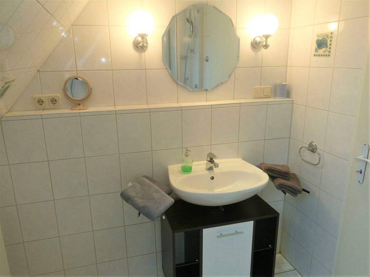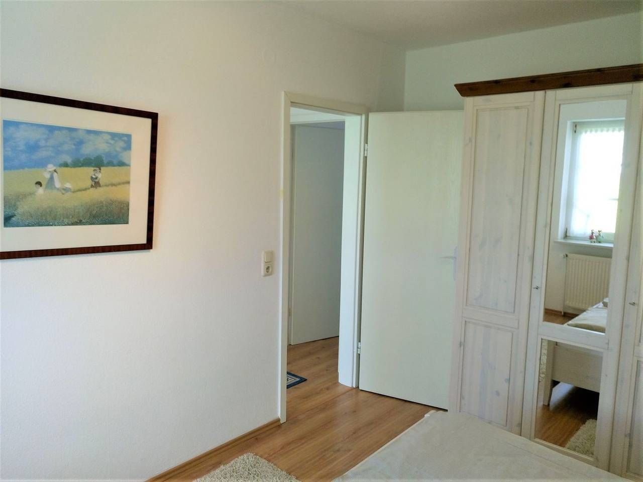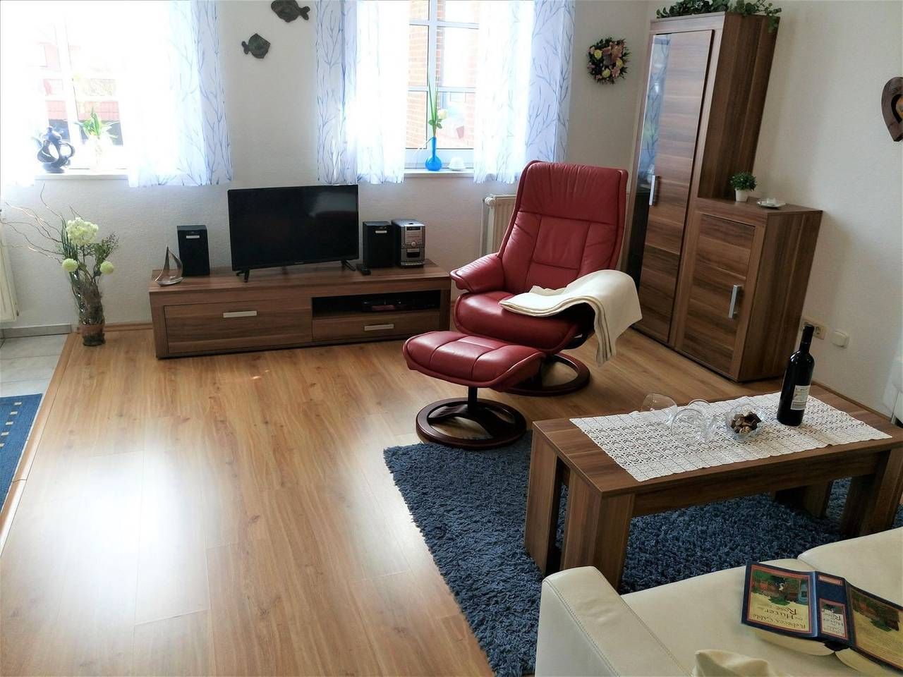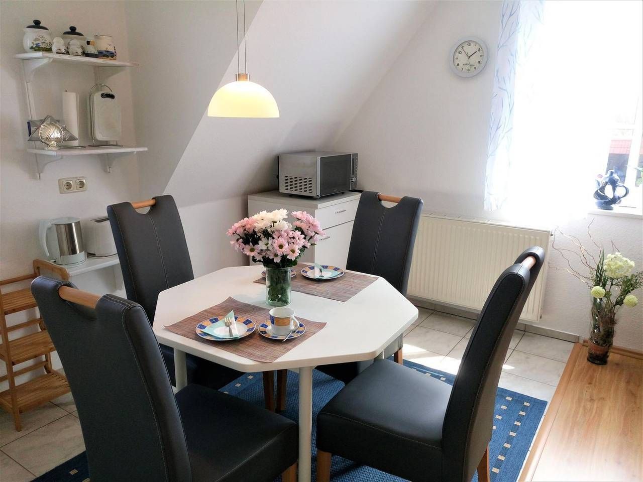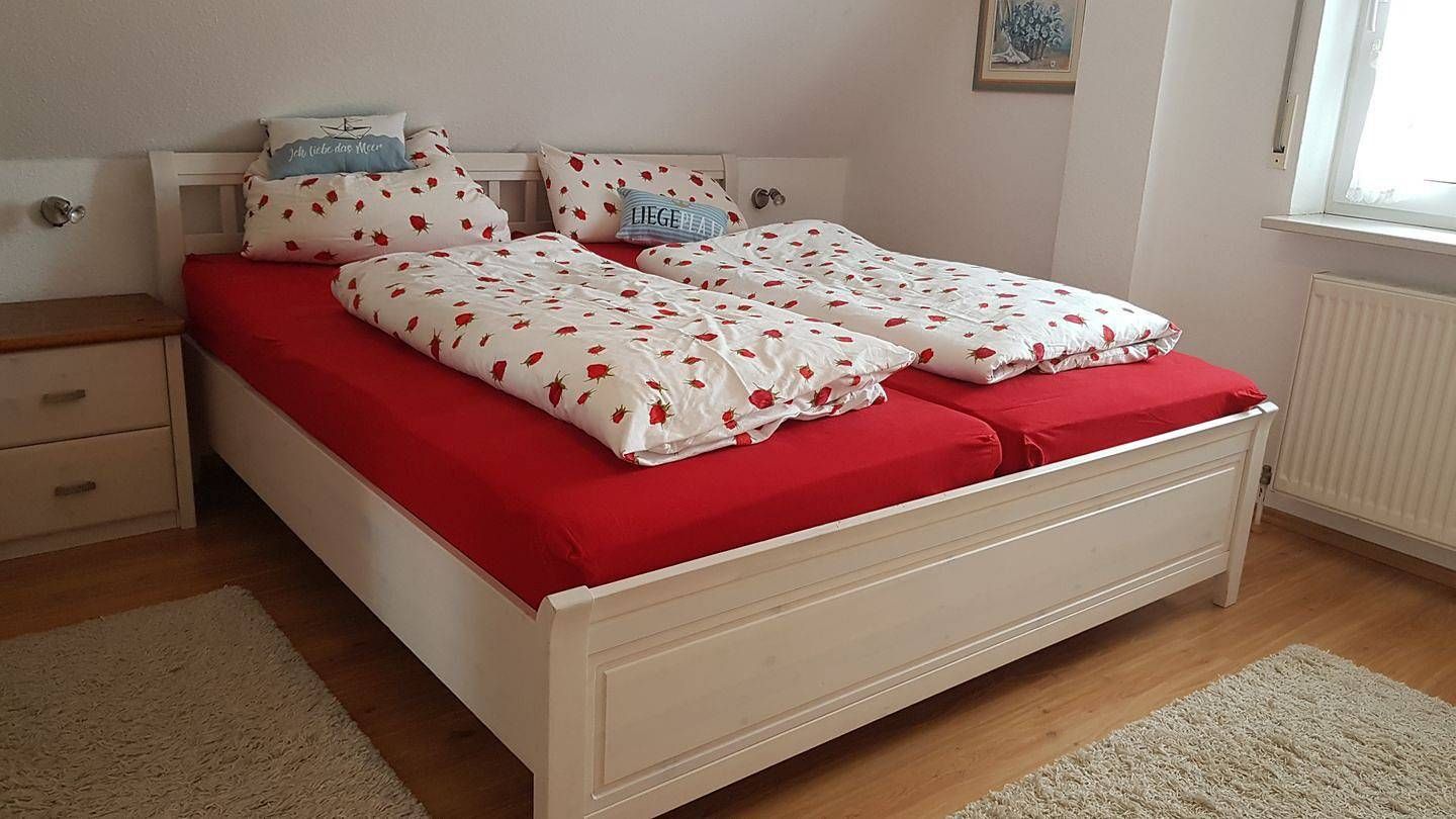Herzlich willkommen in der Ferienwohnung "Wolke 7". Hier finden Sie Ihr Zuhause auf Zeit, in einer ruhigen Sackgassenlage. Mit ca. 50m² bietet die lichtdurchflutete Wohnung ausreichend Platz für 2 Personen. Auch ein Babyreisebett hat hier Platz. Über einen separaten Eingang führt eine Treppe in das Obergeschoss zur Wohnung. Hier erwartet Sie eine geräumige Ferienwohnung mit offenem Wohn-/ Essbereich und Einbauküche, die mit allem ausgestattet ist, um es sich in der Wohnung gemütlich zu machen. Um Brötchen aufzubacken bietet die Mikrowelle eine Heißluftfunktion. Zwei Sofas, ein bequemer Fernsehsessel, ein großer Fernseher oder Bücher stehen bereit , wenn das Wetter einmal nicht so schön ist. An dem Esstisch, in dem hellen Raum, kann man sich mit Köstlichkeiten aus der Region verwöhnen. Ein großzügiges Schlafzimmer mit Doppelbett, die neuen hochwertigen Matratzen passen sich optimal an die jeweilige Schlafposition an, so ist eine erholsame Nacht garantiert. Da sich, wie überall in der Wohnung, Außenjalousien und Fliegengitter vor den Fenstern befinden. Das gepflegte Tageslichtbad komplettiert diese Wohnung. Im Garten steht Ihnen eine eigene Terrasse zur Verfügung, die mit Terrassenmöbeln und einem Strandkorb ausgestattet ist. Hier werden Sie sich bei schönem Wetter sicher sehr wohlfühlen. - Bettwäsche und Handtücher sind nicht inklusive, können aber kostenpflichtig dazu gebucht werden - Parkplatz am Haus, für 1 Auto oder 2 Motorräder - Kostenfreies W- LAN, für Störungen und Ausfälle übernehmen wir keine Haftung - Separate Terrasse im Garten mit Strandkorb - Außenjalousien und Fliegengitter - Abschließbares Gartenhäuschen für Fahrräder usw.. - 500m bis zur Familienlagune