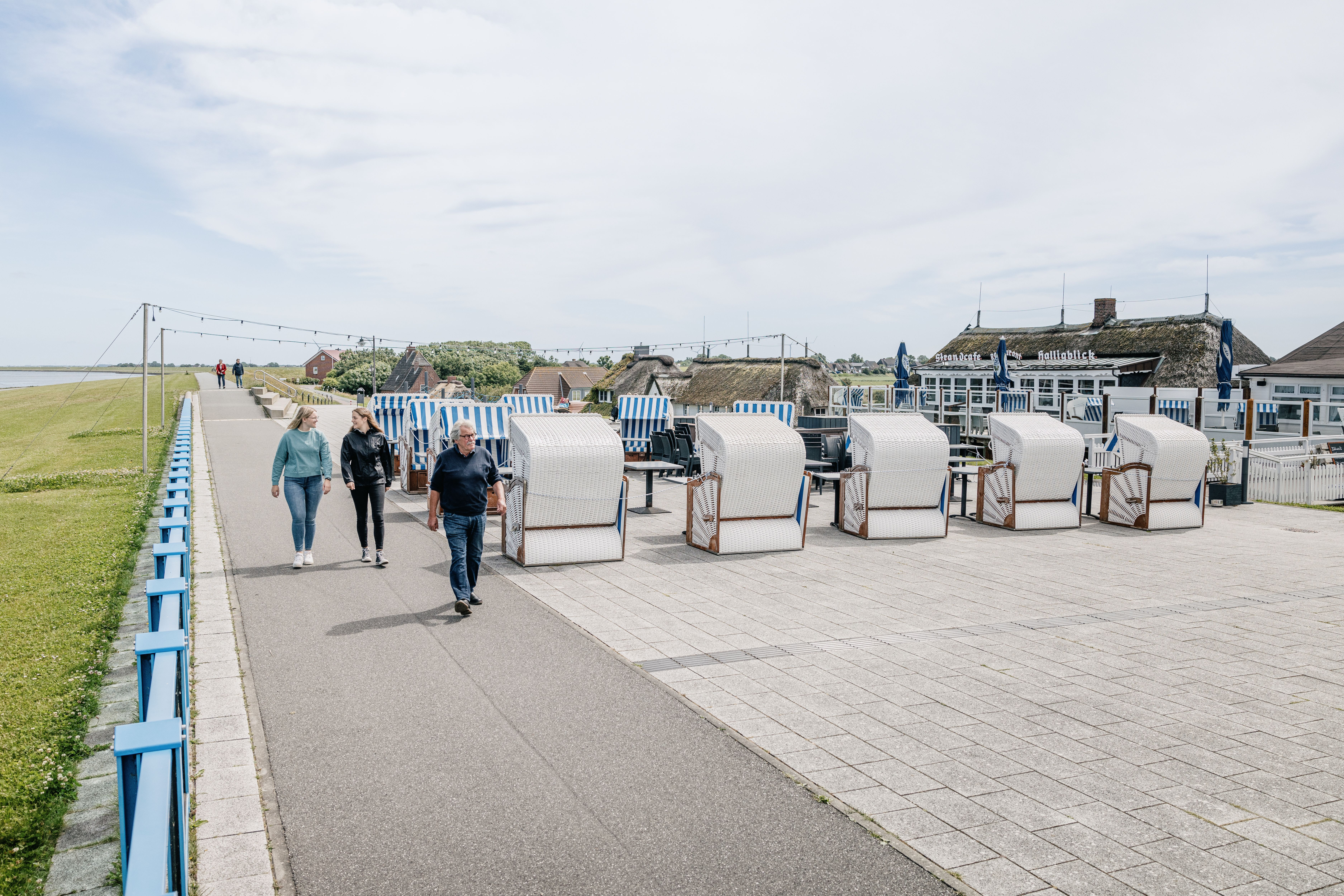 Direkte Lage am Deich und viele Sitzmöglichkeiten auf der Terasse: So kann man die wunderschöne Aussicht auf der Promenade bei einem Essen genießen.
