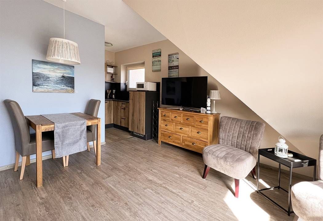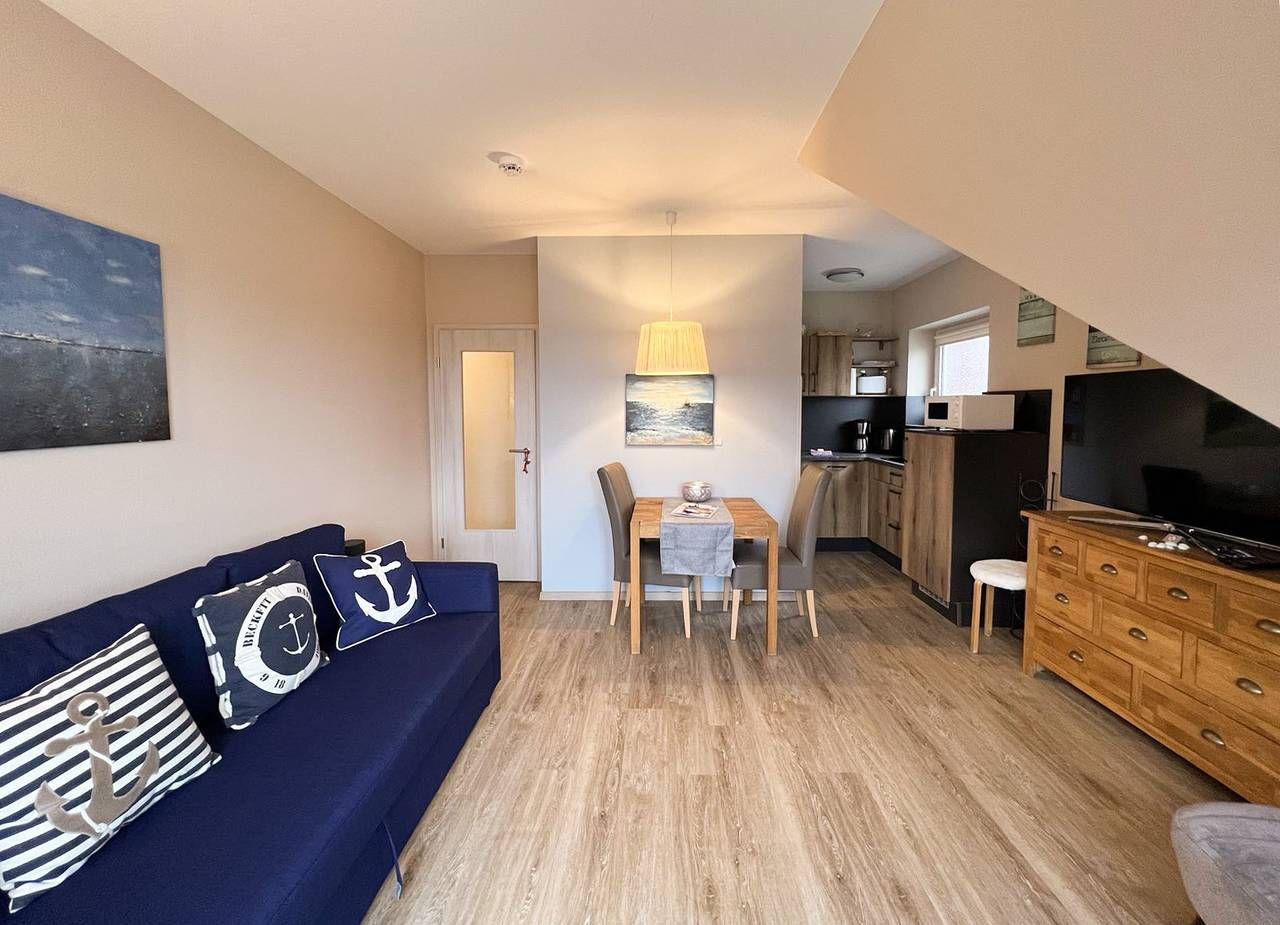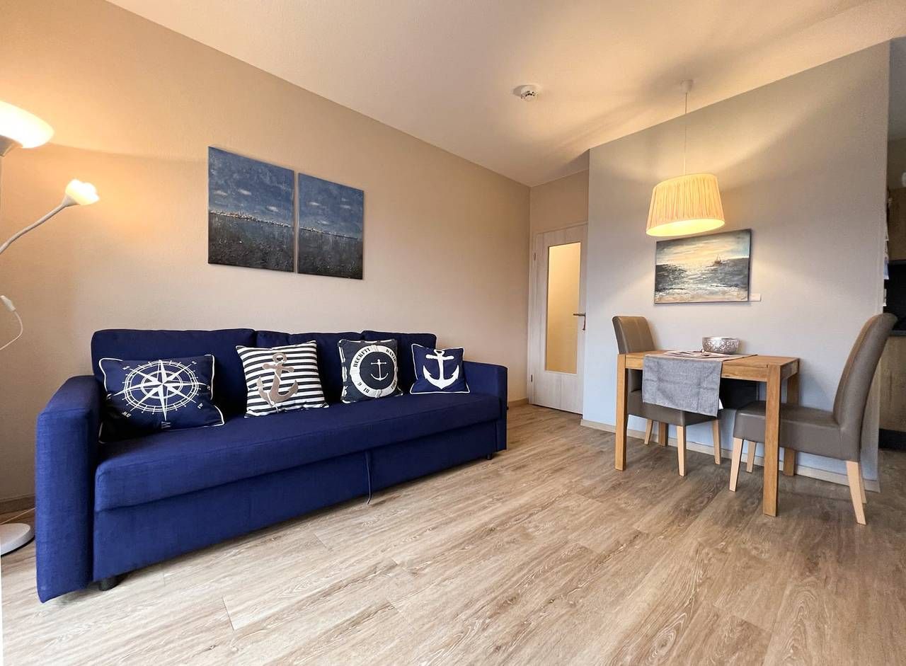 Das 45qm große Apartment bietet auf kleinem Raum alles, was man für einen Urlaub braucht. Seit dem 01.03.23 komplett renoviert. 1 Schlafzimmer mit Doppelbett und 1 Schlafzimmer mit Einzelbett welches zu einem Doppelbett ausgezogen werden kann, Duschbad, 2022 eingebaute voll ausgestattete Küchenecke mit Spülmaschine, Wohnzimmer mit Essecke und Sofa, welches zusätzlich noch als Doppelschlafsofa ausgezogen werden kann. Die Wohnung ist mit zwei Fernsehen ausgestattet, wo der Hauptfernseher mit 1&1 und diversen Streamingapps versehen ist. Der 2. Fernseher kann mit Ihrem eigenen Streamingstick bedient werden. Kostenfreies Breitband Wlan steht zur Verfügung. Der Balkon nach Osten lädt die Morgensonne zum Frühstück ein. Eine Gemeinschaftswaschmaschine, Trockner und ein großer Gemeinschaftsfahrradschuppen ist vorhanden. Dort befindet sich auch der eigene Bollerwagen, womit man alles komfortable zum Wasser transportieren kann. In 5 Minuten Fußweg ist man am Sandstrand der Familienlagune Perlenbucht mit seinen vielfältigen Wassersportmöglichkeiten, Bar/Imbiss und Spielplatz. Ein eigener Strandkorb in der Saison von Mai bis September kostenfrei zur Verfügung. Die Innenstadt mit dem Erlebnisbad und diversen Restaurants und Einkaufsmöglichkeiten ist nach 1,5 Km Radtour am Deich entlang erreicht